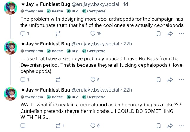 We have finally filled up the Devonian period with a design! And if you're confused on why exactly it is a cephalopod and not an insects... well if you follow me on Bluesky you might have seen my rant...