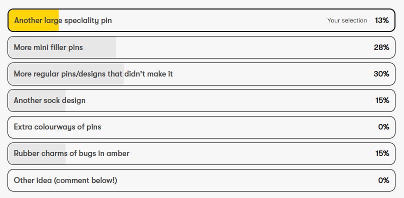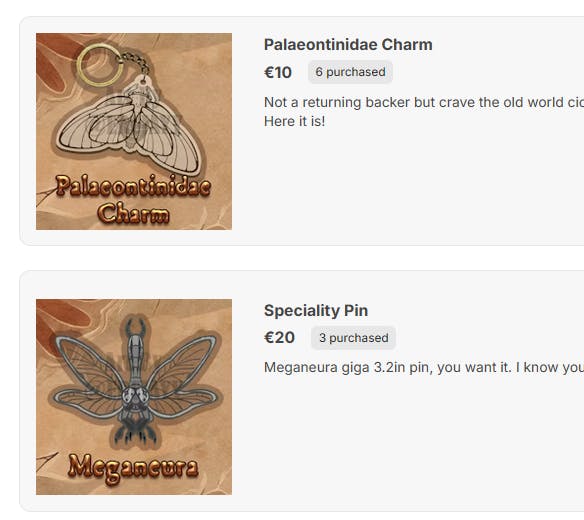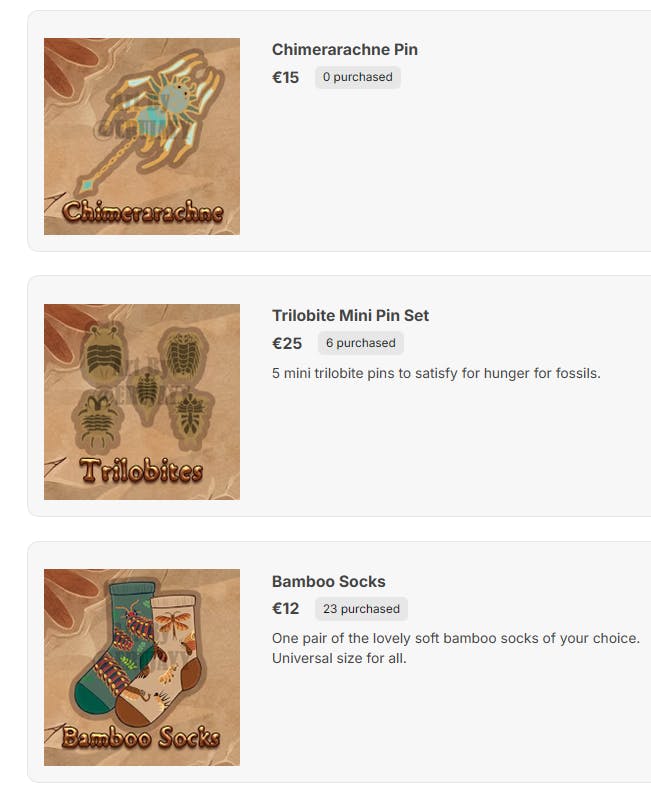 Lots of you requested mini pins, which can totally be done. Three of the designs will unlock at €4400. And I admint, the giant arhtropleura pin (which will be 10cm in length) is a little self indulgent, but self indulgence has never killed anyone has it?
