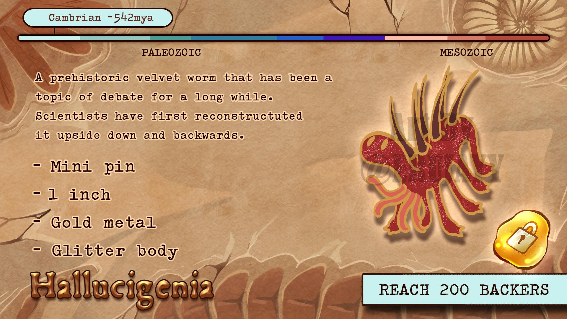 The Hallucigenia will unlock if we hit 200 backers! And it will be considered a mini pin along with the other three. There will be a set of them made.