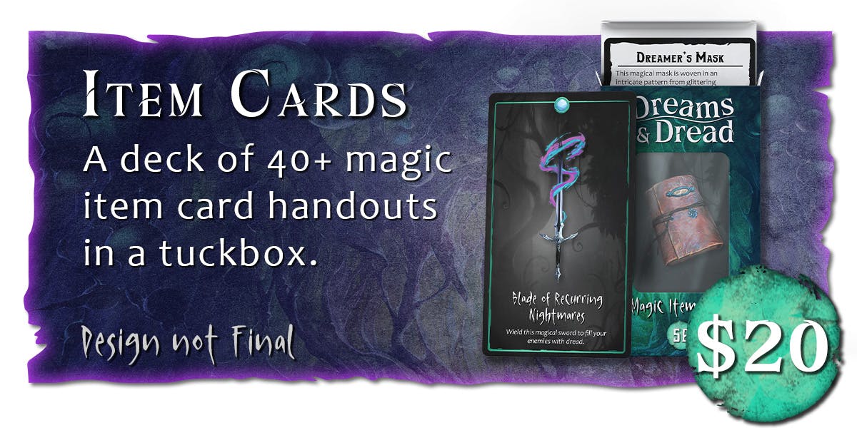Grab the 40+ magic items in Dreams & Dread as handy tarot-sized card handouts!