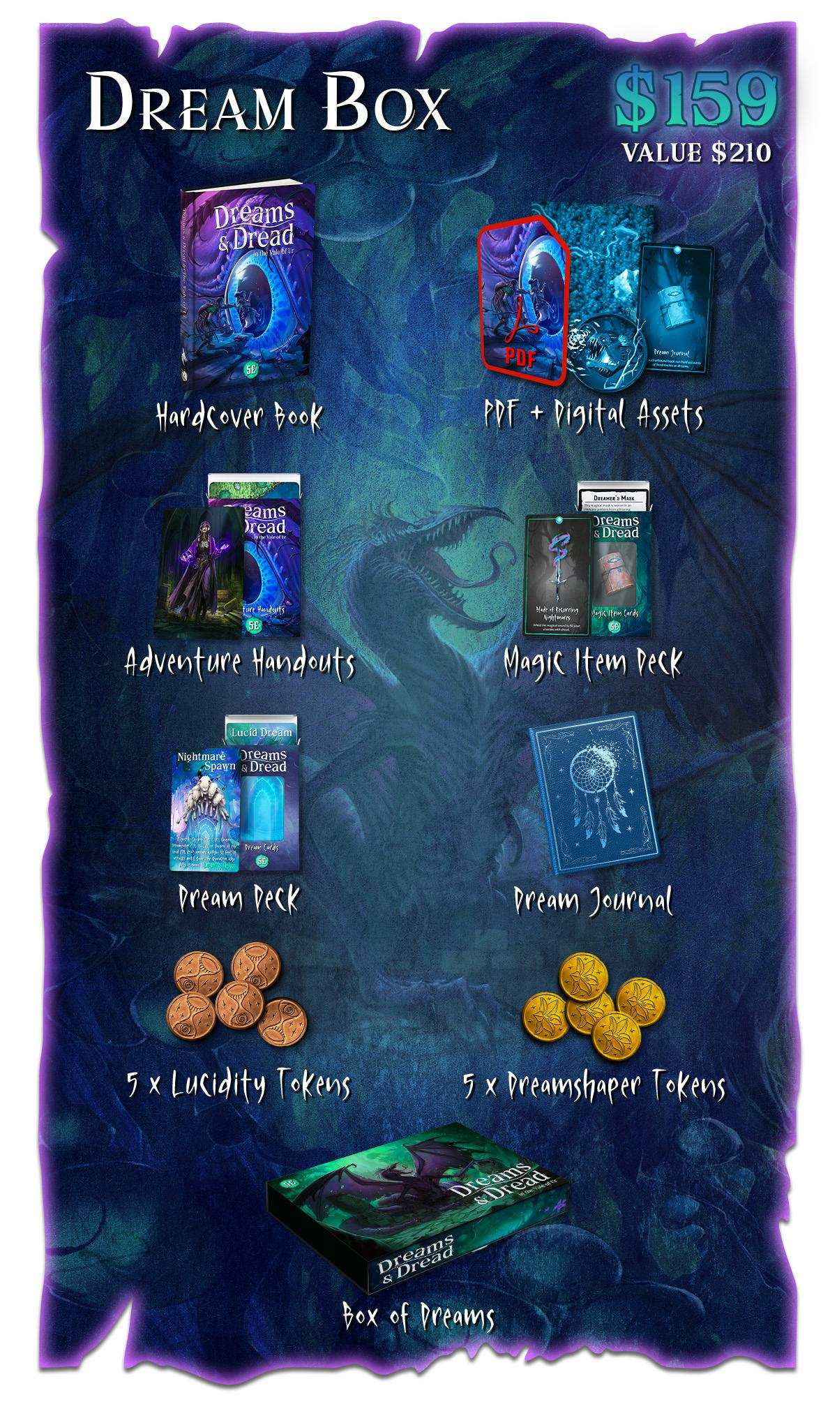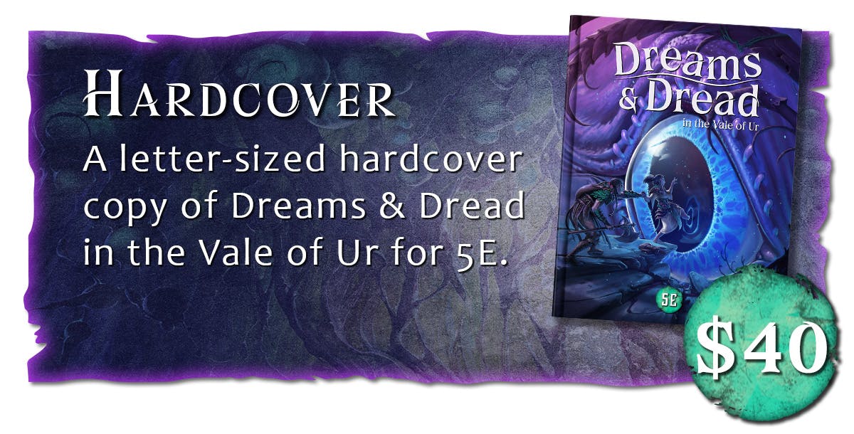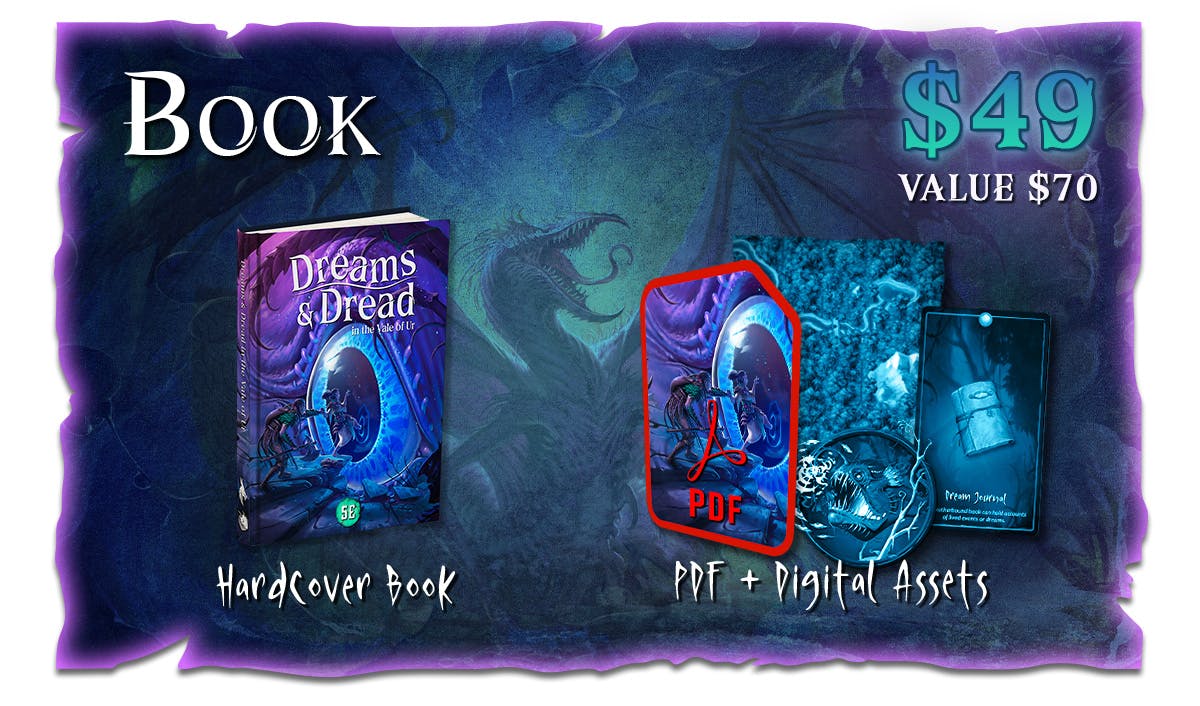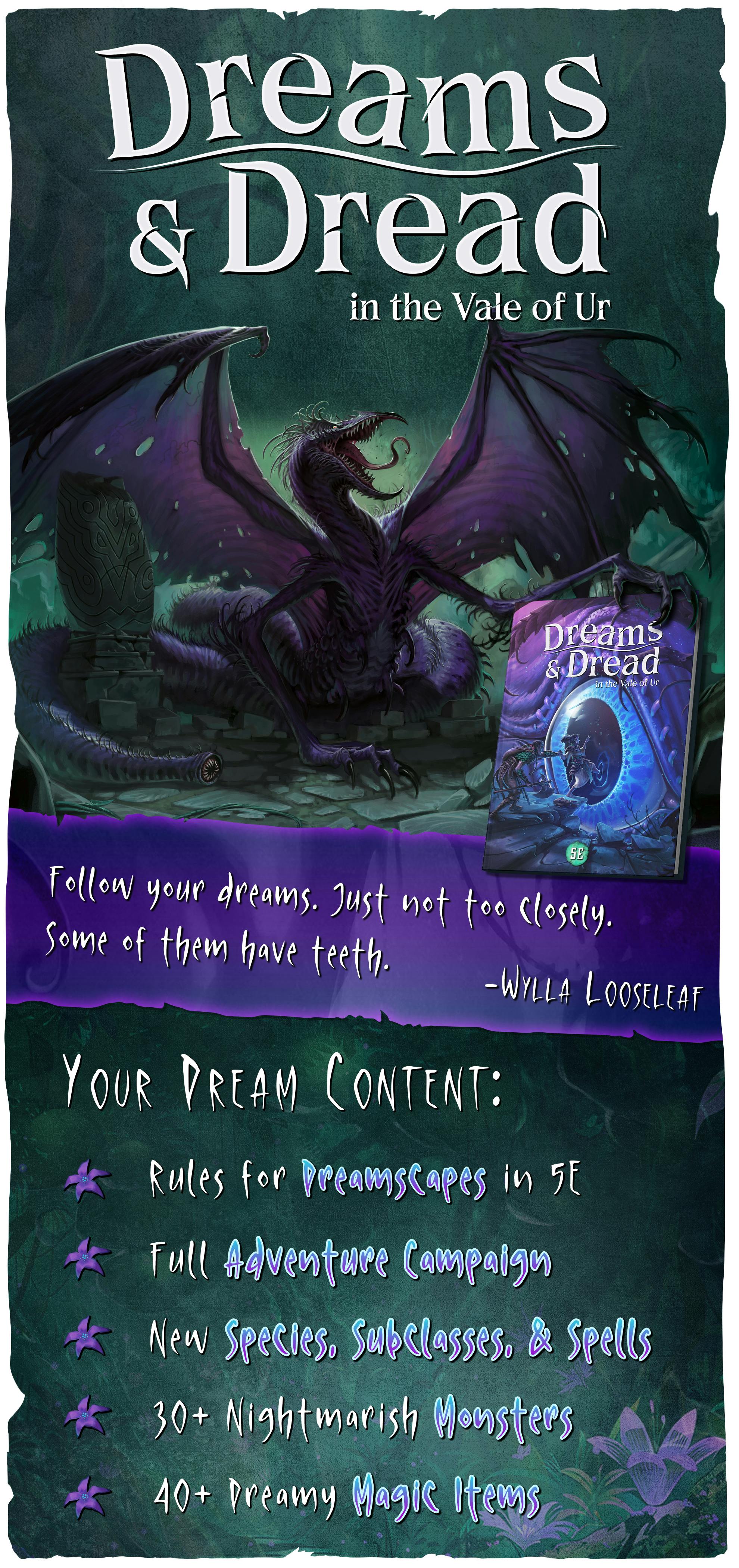 Make your dreams come true – and face your worst nightmares in Dreams & Dread in the Vale of Ur – a 5E sourcebook & adventure campaign filled with monsters, magic items, player options, and new rules inspired by dreams and nightmares.