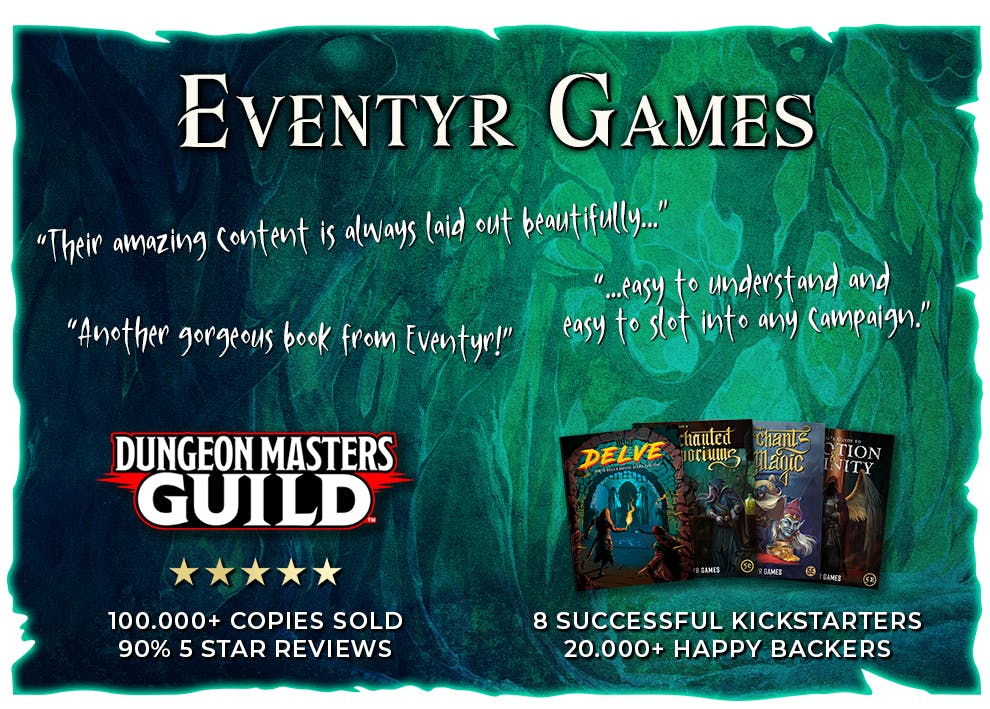 Eventyr Games is a small indie publisher from H.C. Andersen's Denmark. Fueled by equal parts passion, expertise, and inability to hold down a real job, making high-quality 5E sourcebooks that are easy-to-use for the DM and unlimited fun for the players is our bread-and-butter!