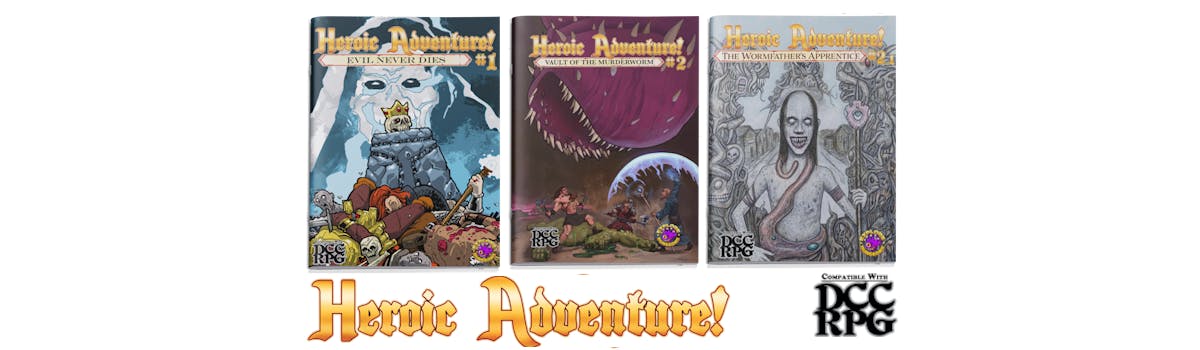 HEROIC ADVENTURE! (available for DCC RPG and 5e!) #1 - Evil Never Dies - Defeat a time-traveling lich and save the town on Emerson (again)! #2 - Vault of the Murderworm - The mountain town of Sawtooth has a BIG problem. #2.1 - The Wormfather's Apprentice - The town of Sawtooth still has a few problems!