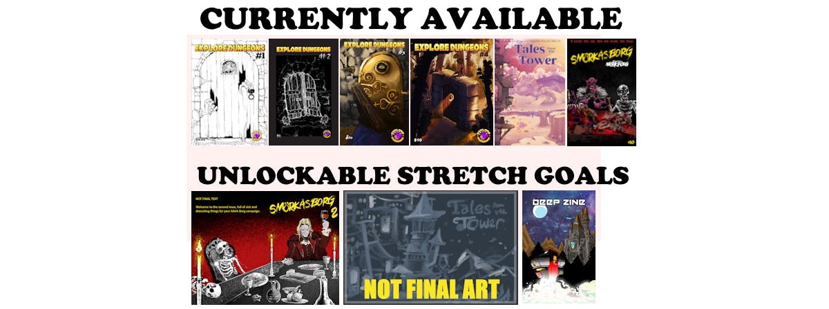 This is absolutely the cheapest way to get the original 5 zines, the new Explore Dungeons #4 zine, the 3 stretch goal zines (if unlocked) AND the mystery stretch goal!