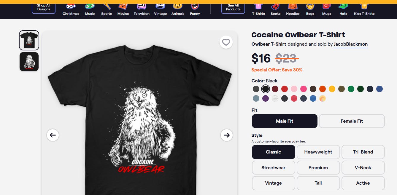 Hey -if you're looking for a present for that hard to shop for cranky uncle this Christmas - our cover artist, Jacob Blackmon, has created a Cocaine Owlbear T-shirt and it's on sale right now for just $16 or so