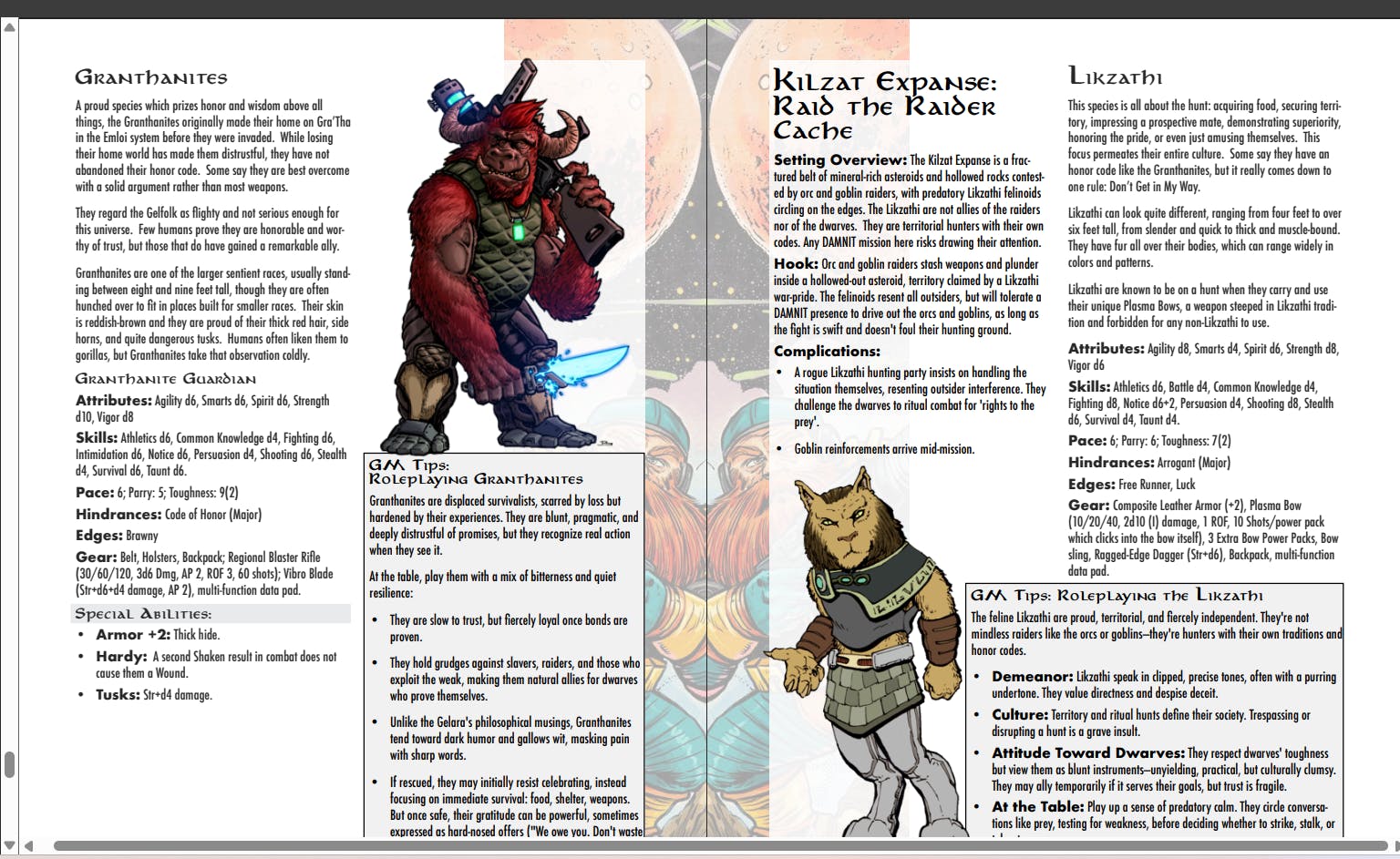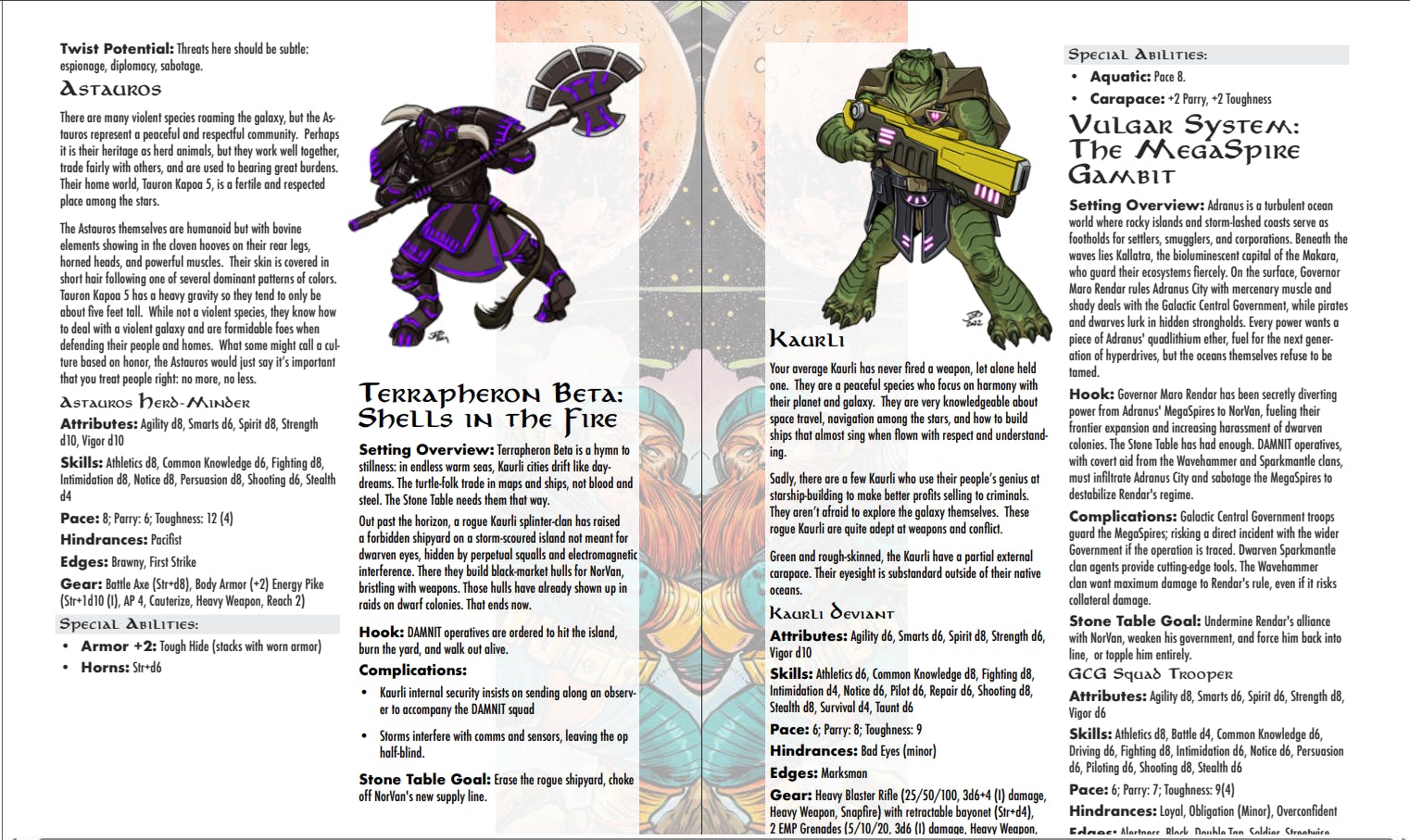 Bonus preview: here are a couple pages from the Faction Encounters appendix showing scenario hooks for different factions.
