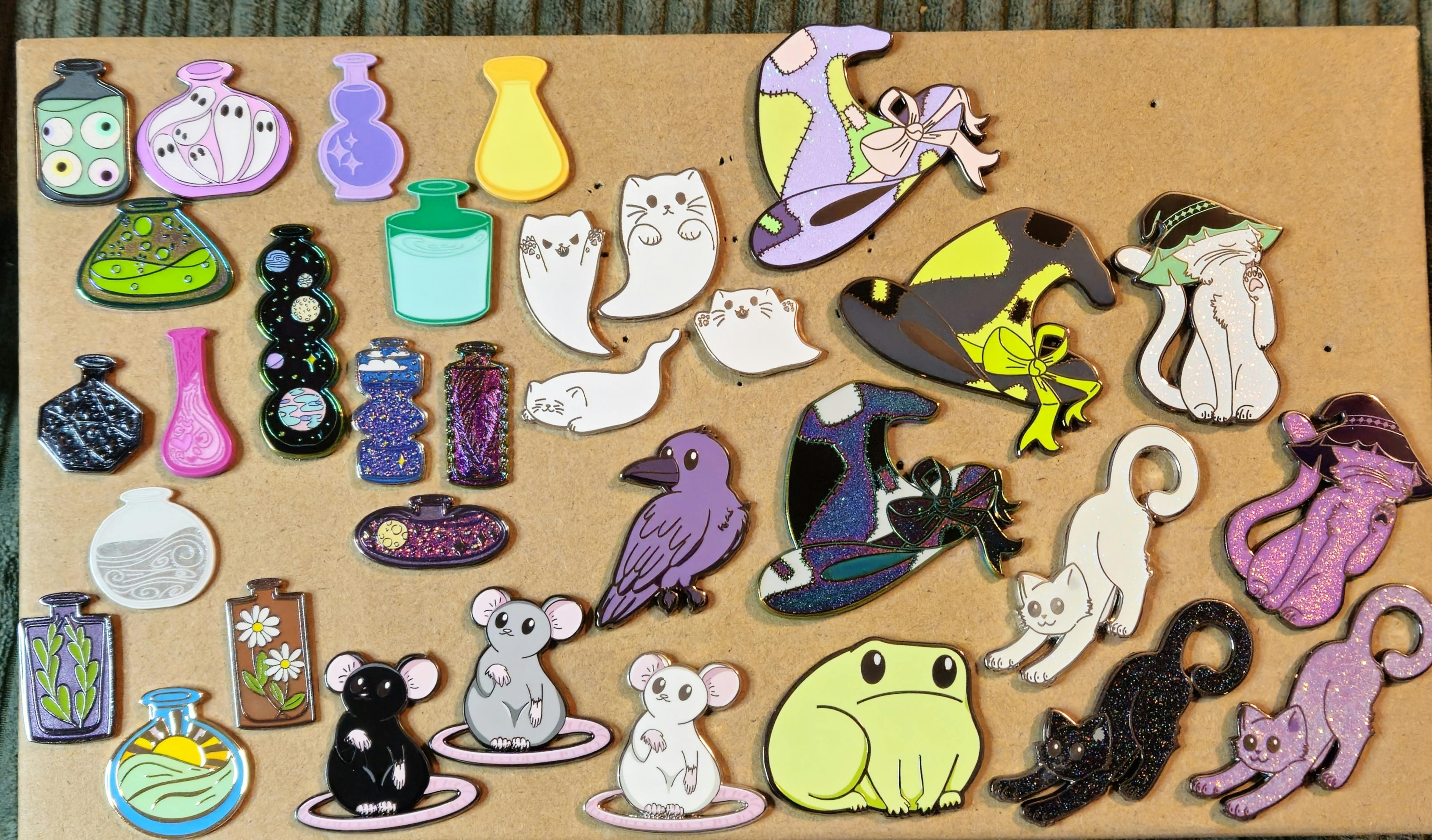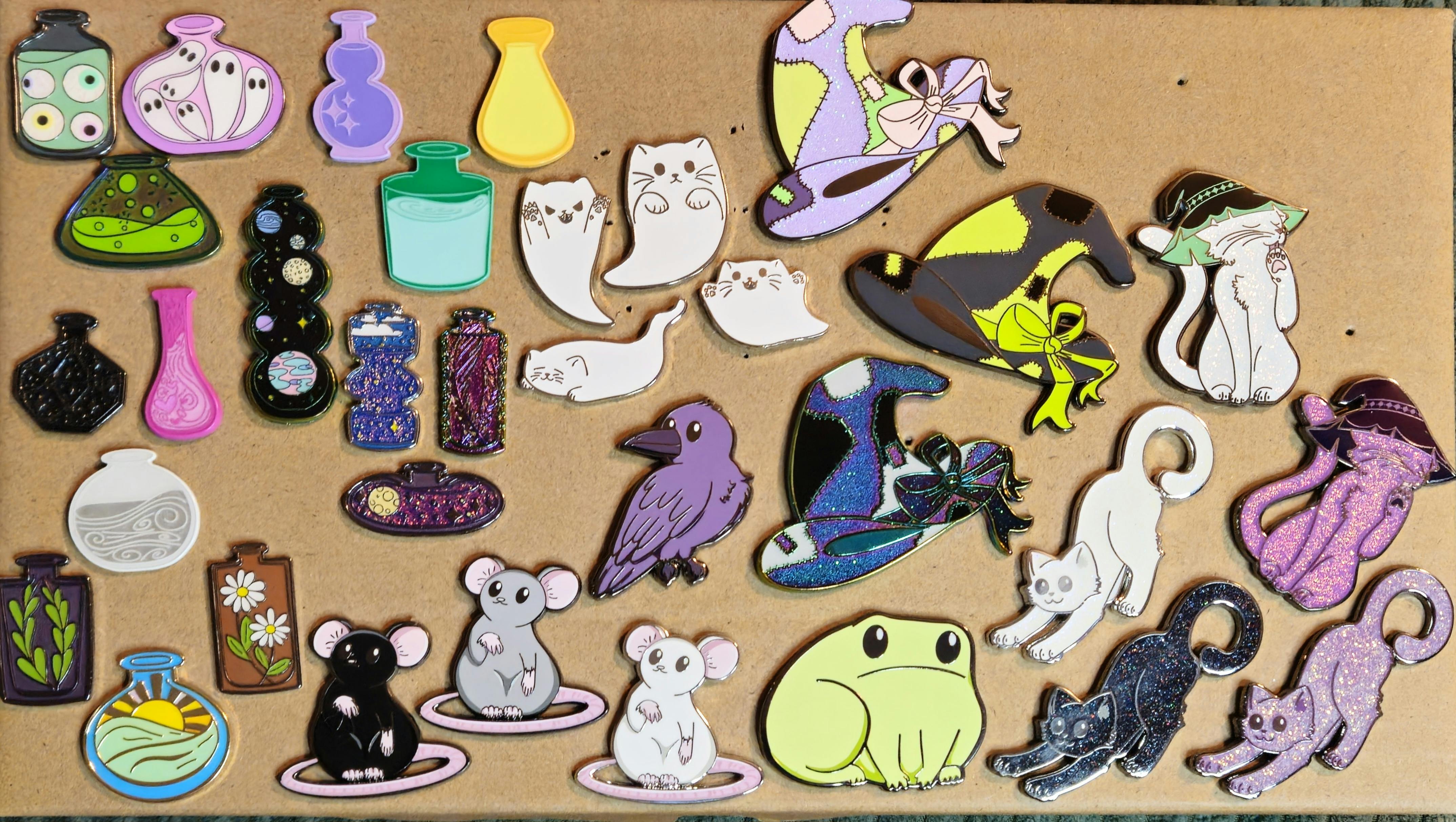 The potions all look great, however the white and pink potions, which were supposed to be chrome plated, did NOT end up chrome plated. This is a mixture of an oversight on my part (I did approve proofs stating dyed metal, but both pins on the invoice stated chrome metal & I was charged for it...so I am negotiating a paid remake of these, minus the mold fees and chrome plating fees, to be sent along with the froggy & other remakes). The feathers potion needing WHITE tinted translucent enamel seemed to elude the factory as well so it's just...fully clear enamel over rainbow. If you all are happy with this, I think it honestly looks fine, and will not be as nit-picky here. The feathers are half-raised metal and look pretty neat beneath the clear!