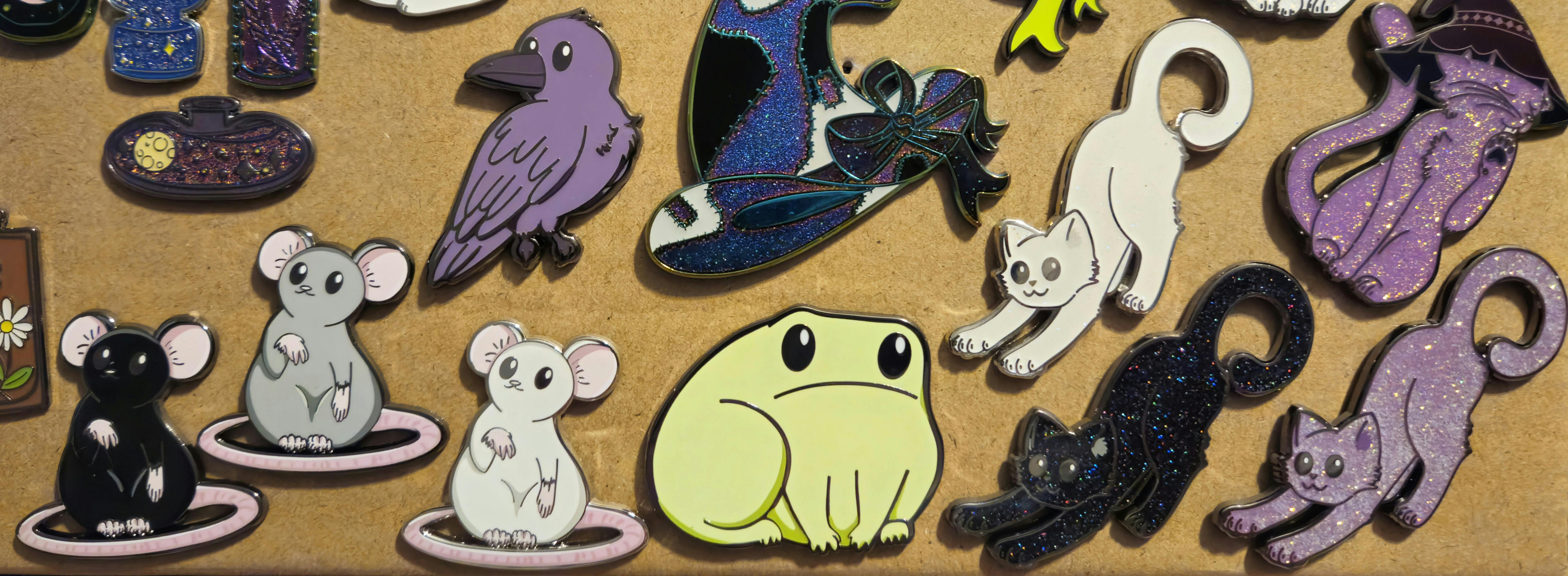 The rainbow witch hat used the entirely wrong glitter - and like, the tiniest amount possible of it. I think it looks more like a mistake than anything - and nothing like what I intended (a finer mica-type powder one of my manus called diamond dust). This may be another case of me being too picky, but I intend to receive a full remake of these with the correct glitters, because I'm really not a fan of the glitter they have in there. It's so sparse that it's nearly impossible to catch on camera, tbh (which is part of why I didn't clock it when I was sent update photos). It just looks bad to me, and I really would like all my pins to be something that I am happy with so I feel better selling them to all of you!