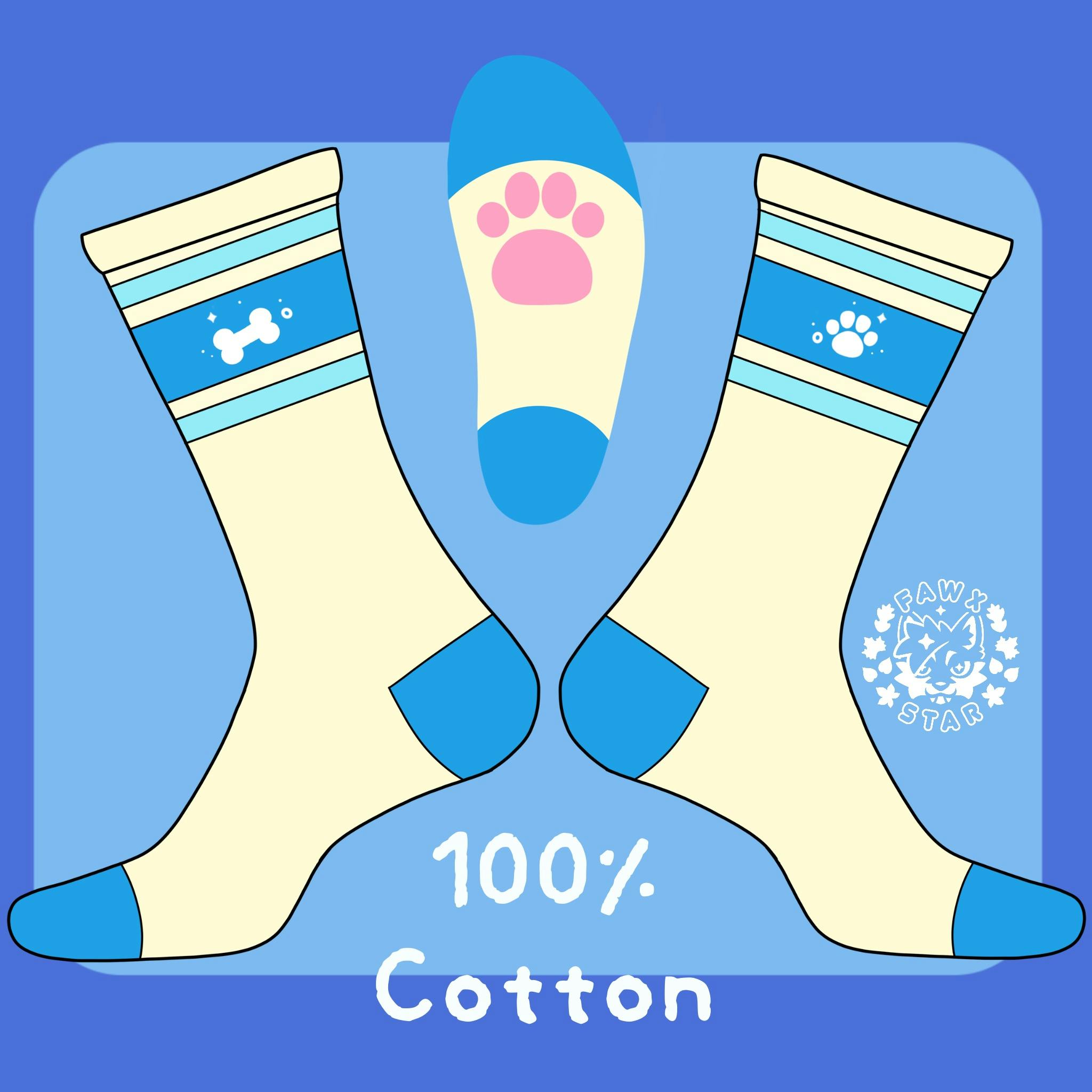 Socks are woven cotton yard with embroidered detailing. Paw pad is woven in and flat.