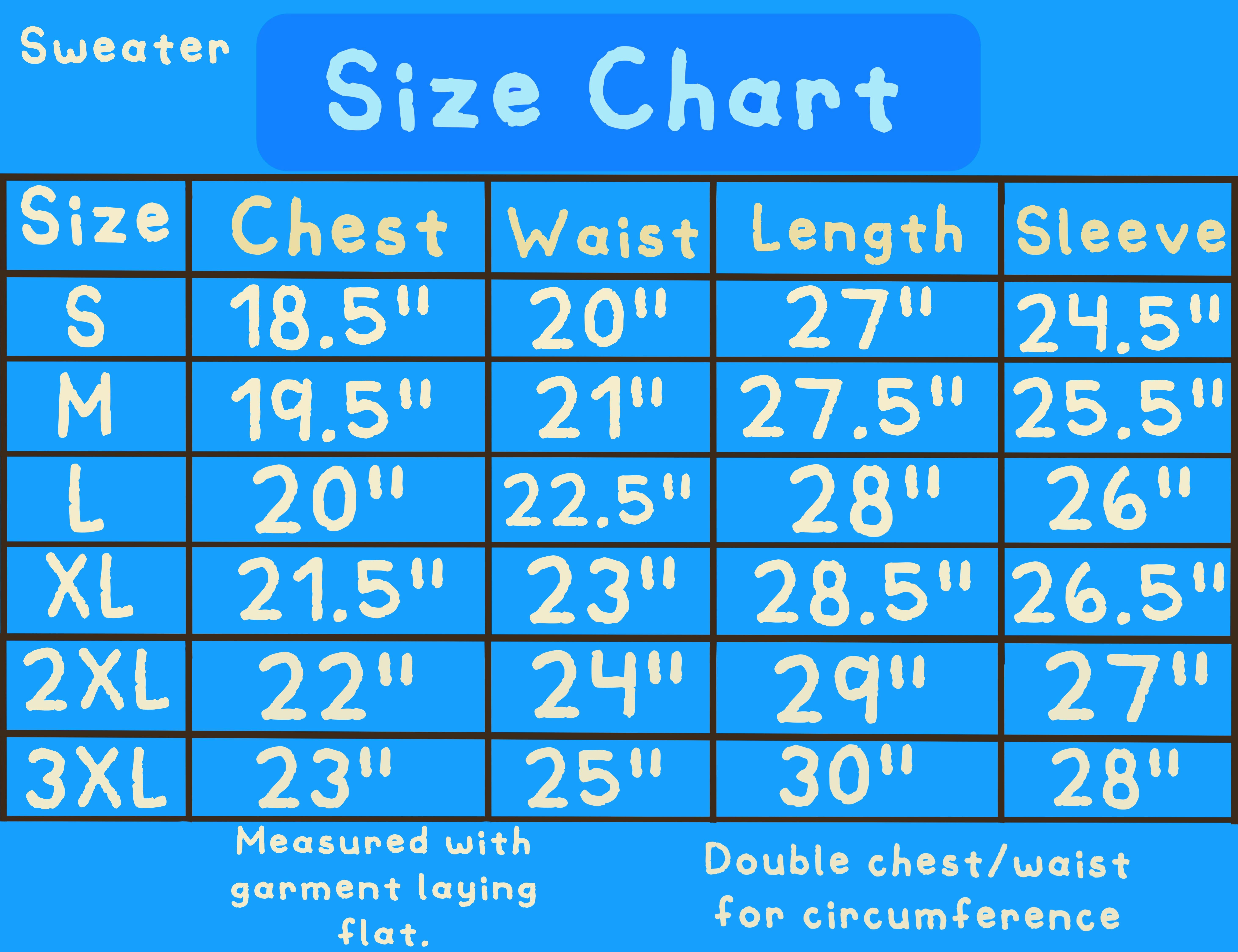 Please measure yourself with these measurements and compare. All measurements are in inches. Measured with the sweaters laying flat. Double the measurements for chest and waist circumference