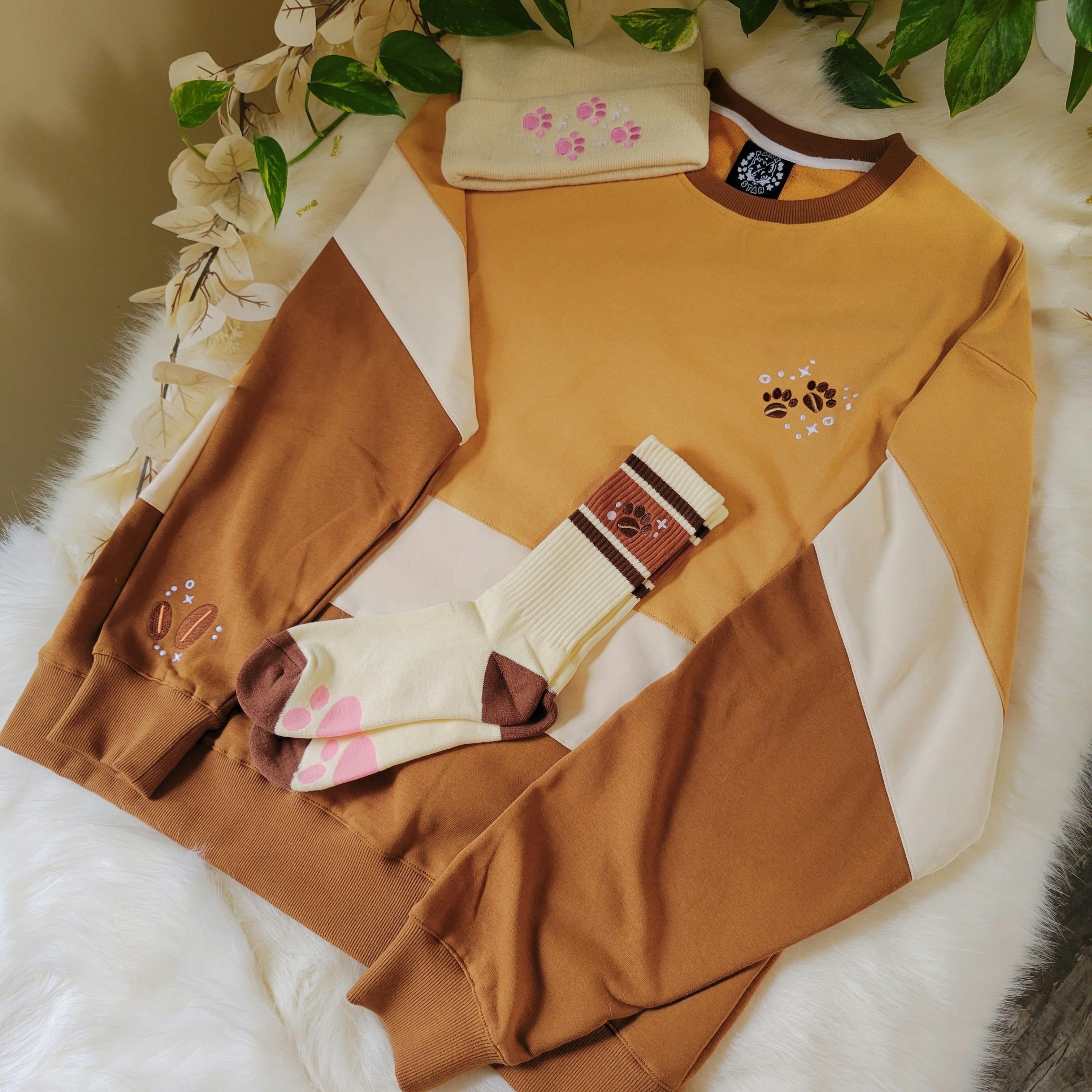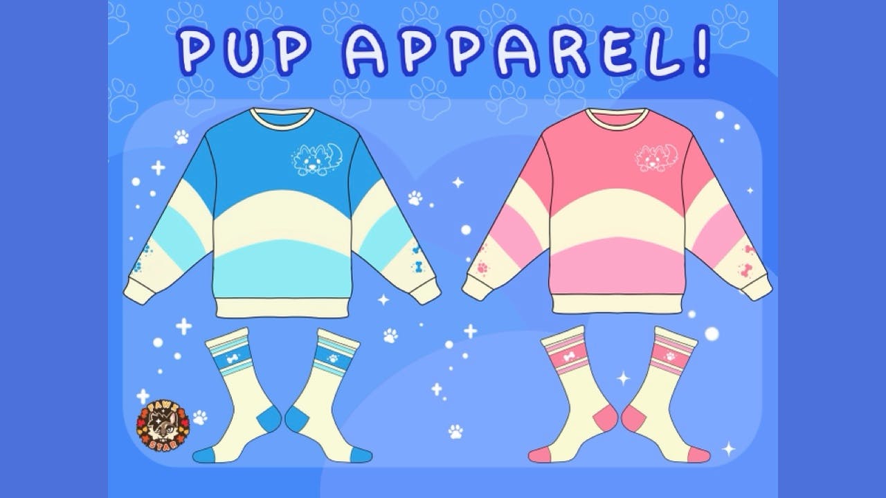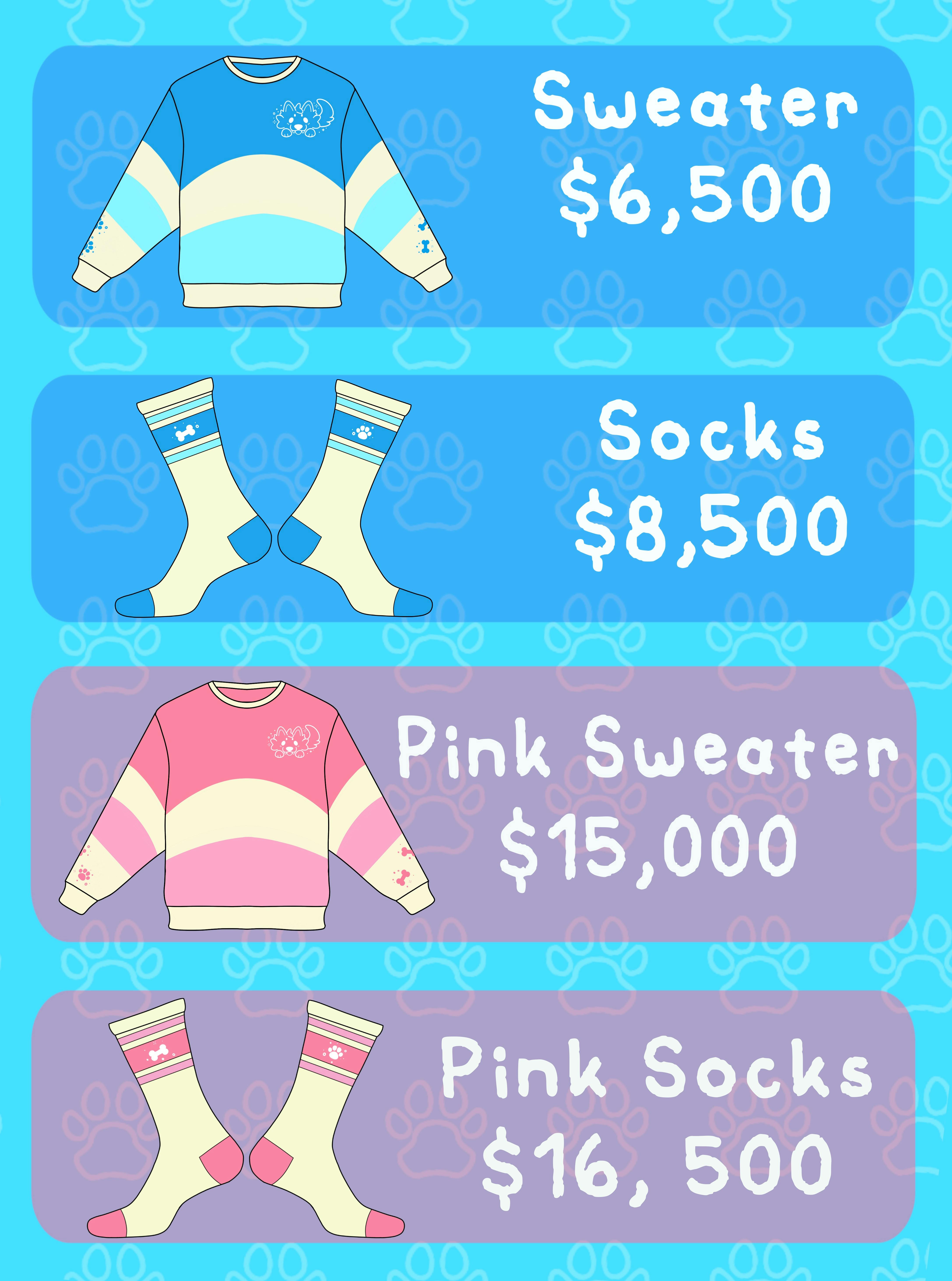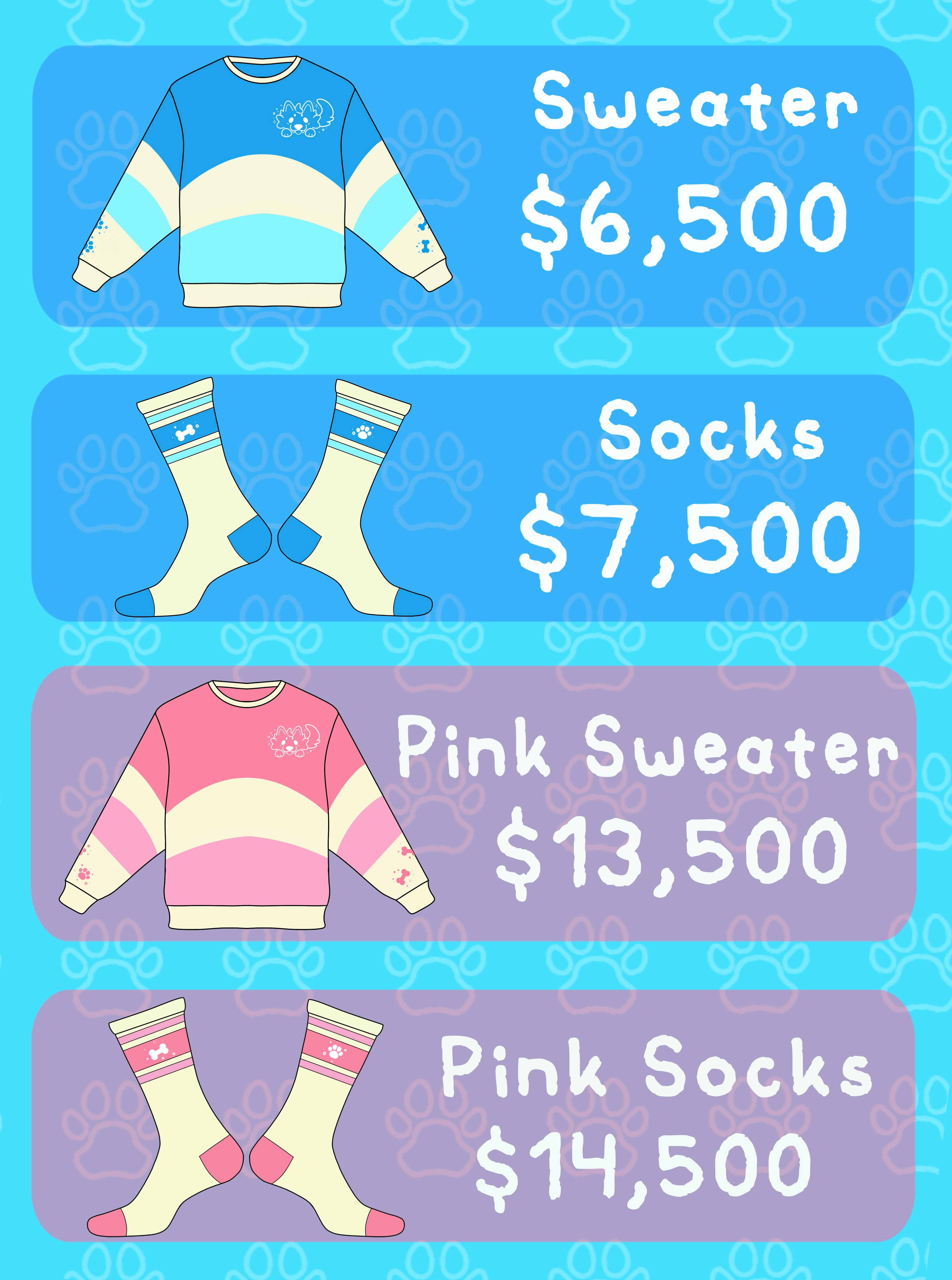 Each tier unlocks at the goal listed below - If somehow we stretch past the last tier, shirts and beanies will be unlocked! It is a huge stretch, but the sweaters and socks have been the most popular during my campaign previews and with my previous project Puppy Cafe. Many people expressed interest in the pink line, therefore I decided to shift some things around to include pink as a goal a little bit sooner.