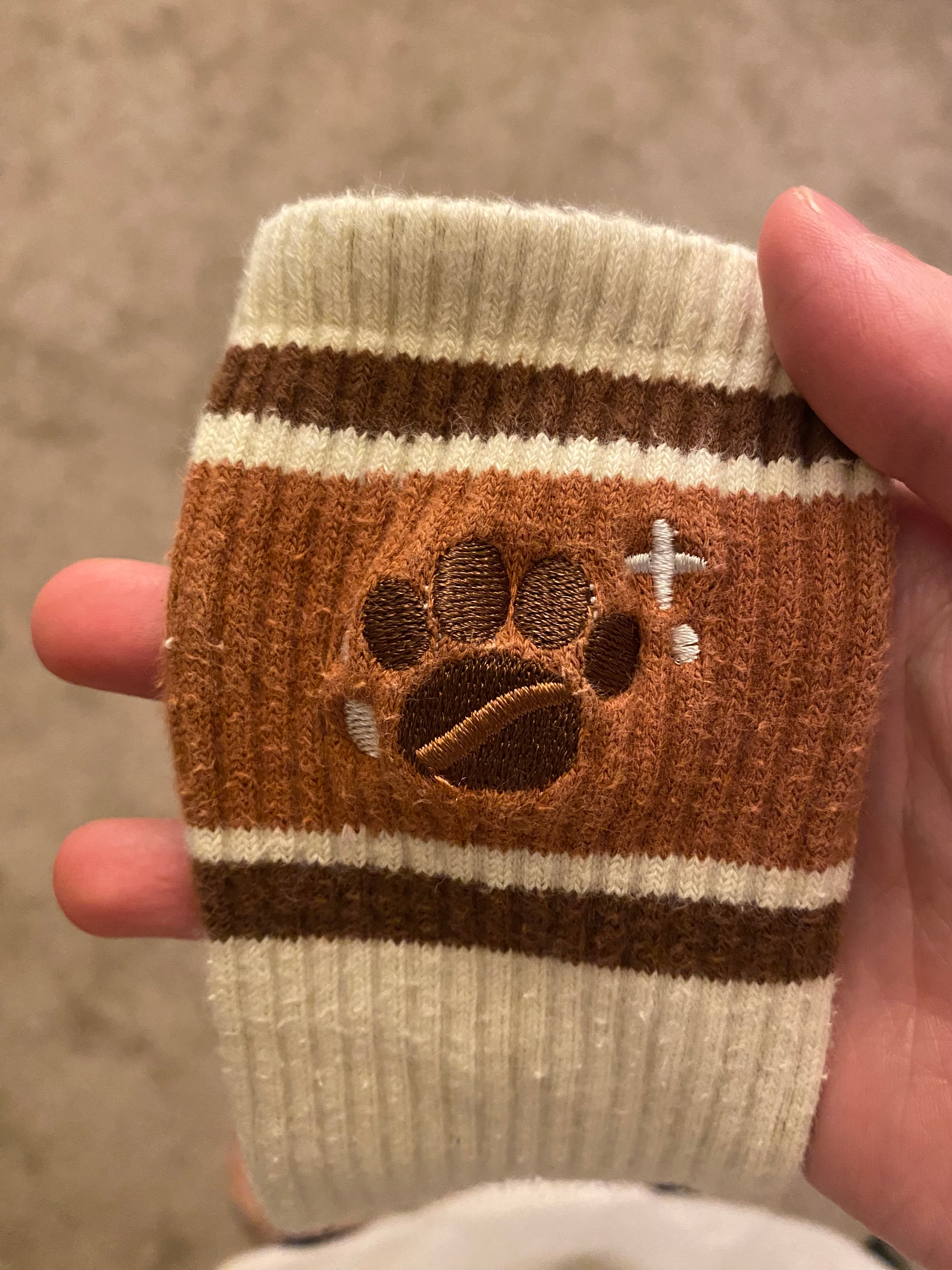 The colors and paw pad look adorable(: colors are a great match to the sweater too!