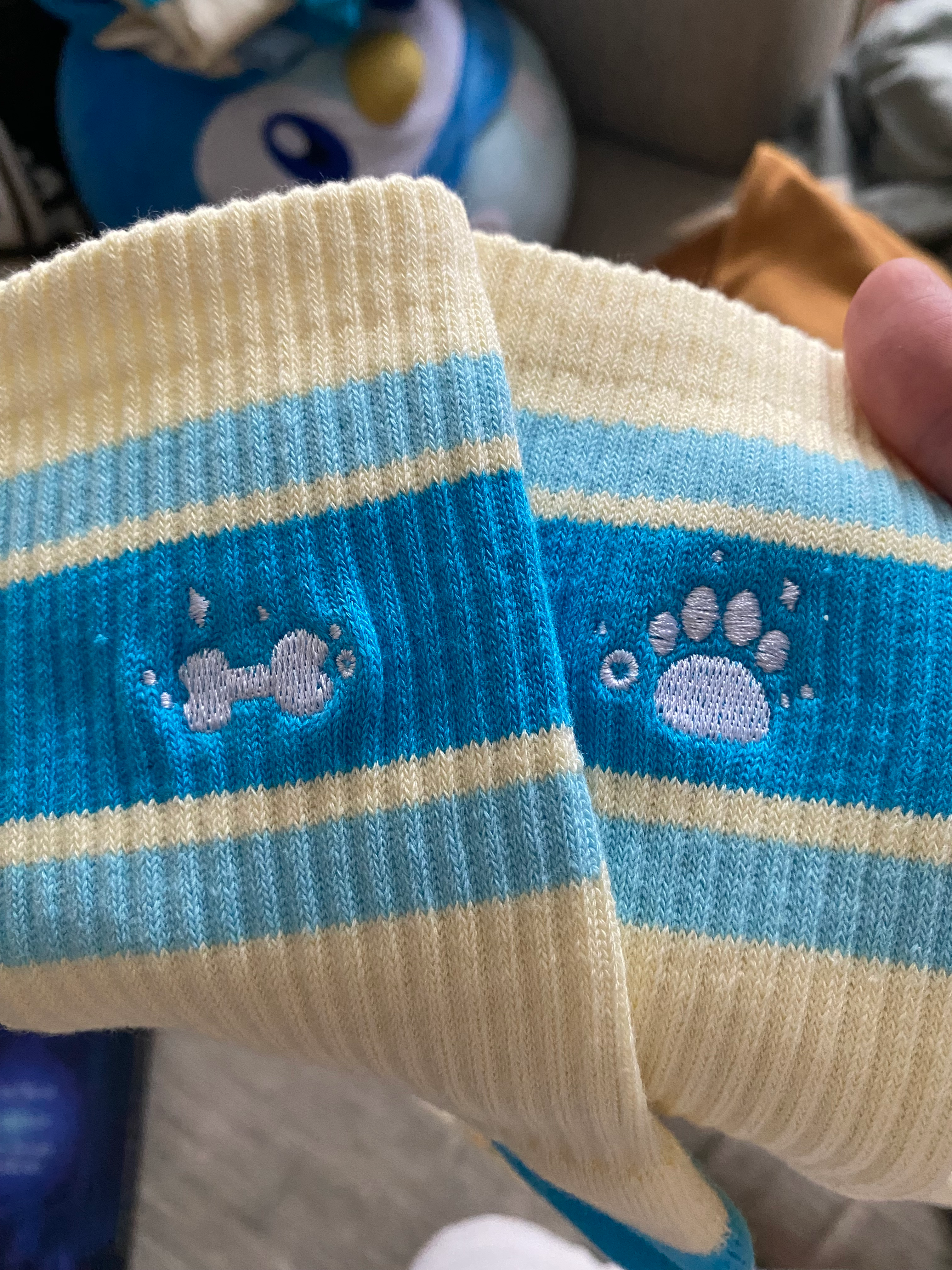 Socks came in, but I’m not pleased with the embroidery. I’ve simplified it further and made the overall design larger. They will look like my Puppy Cafe socks now!