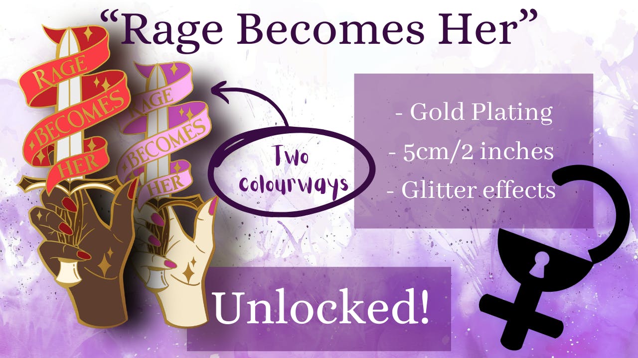 "Rage becomes her" is a double colourway pin that may still undergo some design changes. Rage looks good on all of us.