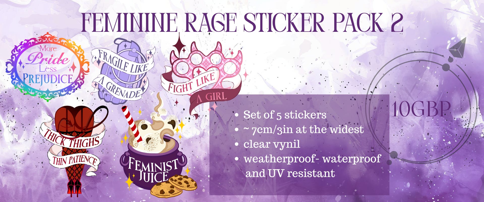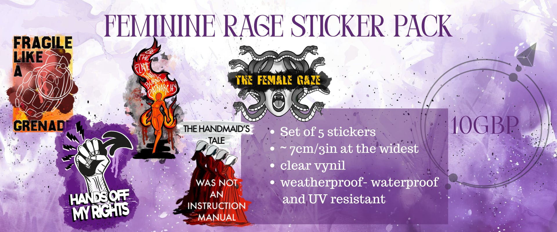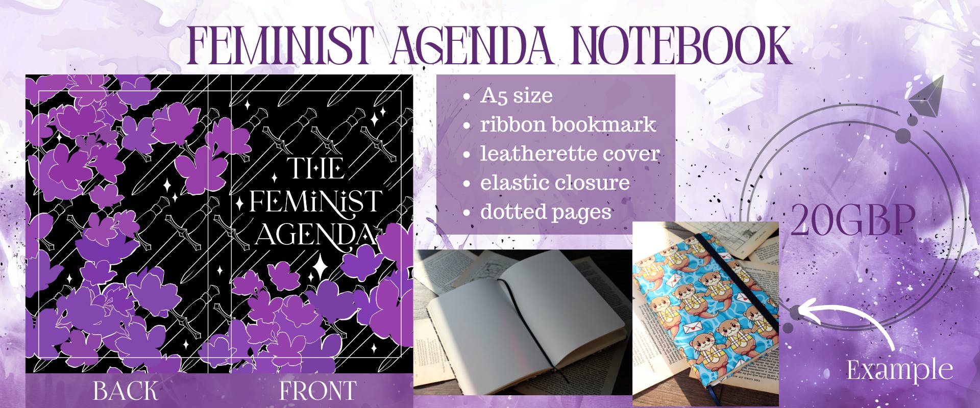 This sticker pack is made up of severall designs i've been playing with. you'll be able to grab them individually after the campaign ends when i send out the pledge manager if you are not interested in the full set! This set includes "be the flame that burns the patriarchy", "fragile like a grenade", "the female gaze", "hands off my rights" and " the handmaid's tale was not an instruction manual". This second set of stickers is ,ade up of redesigns of stickers from the campaign! You'll be able to choose which sticker pack you'd like after the campaign All stickers are translucent and weatherproof. I love me a good notebook, and this pun was too good to resist! This feminist agenda notebook features a dagger pattern overlayed with a cherry blossom pattern in purple tones. The notebooks are dotted, have a little ribbon bookmark in black and an elastic closure in black too. They also feature a small pouch on the back for photos, stencils or documents you may want to keep with the notebook! i have only produced a few notebooks, but completely fell inlove with them and i cant wait to see how this looks!