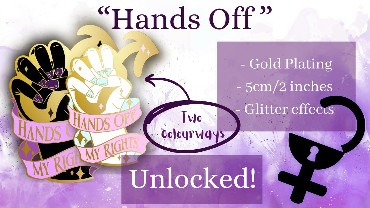 I'm tired of having men make decisions for women's health, and women's rights and any number of things they are completely unqualified to make decisions on. "Hands off my rights" started as a poster design and morphed into a pin, and will have two colourways- one black and purple, and one colour coded like the trans flag.