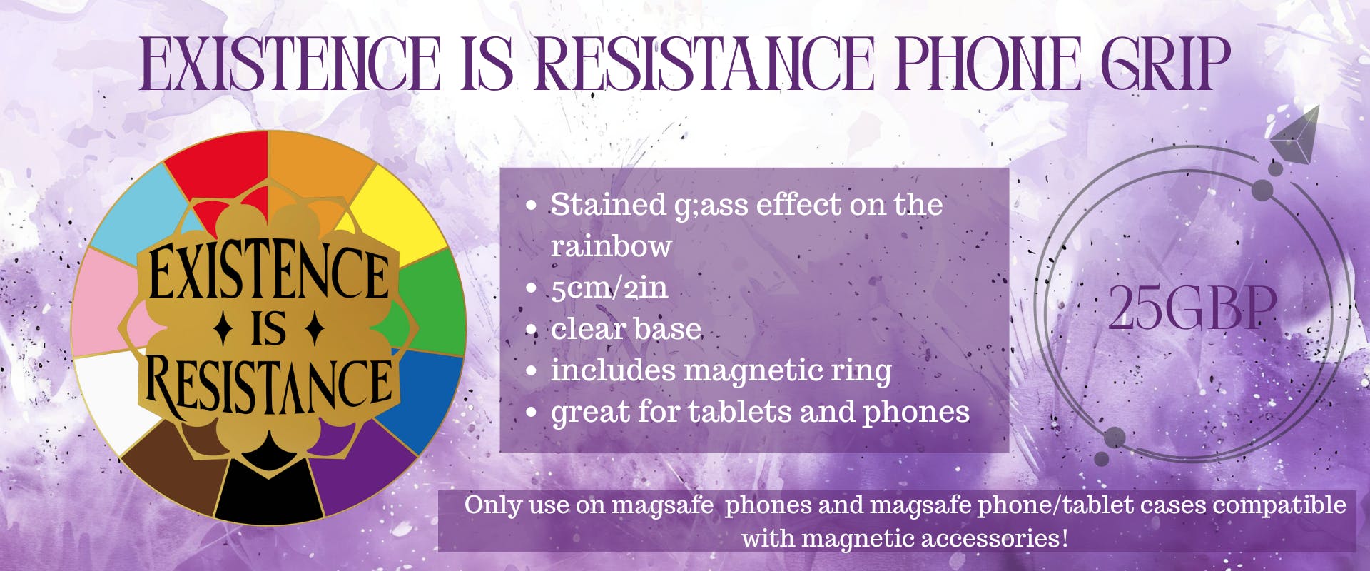 Existence is resistence is a message for everyone of us who has ever been told they dont belong. This phone grip will feature a stained glass effect- that is, all the colours will be translucent. This is a beautiful effect that i have trialed in my last few phone grips and looks amazing.