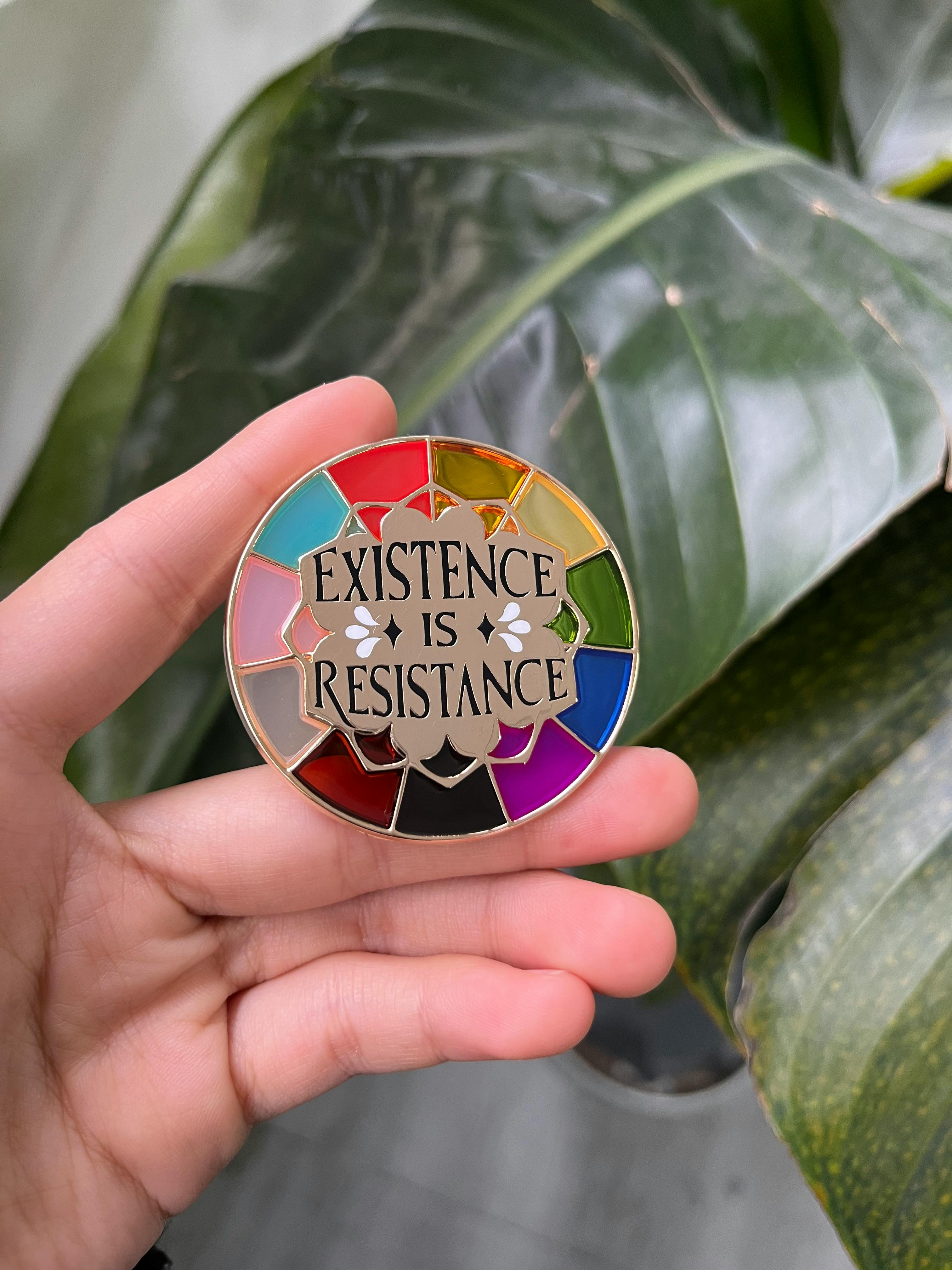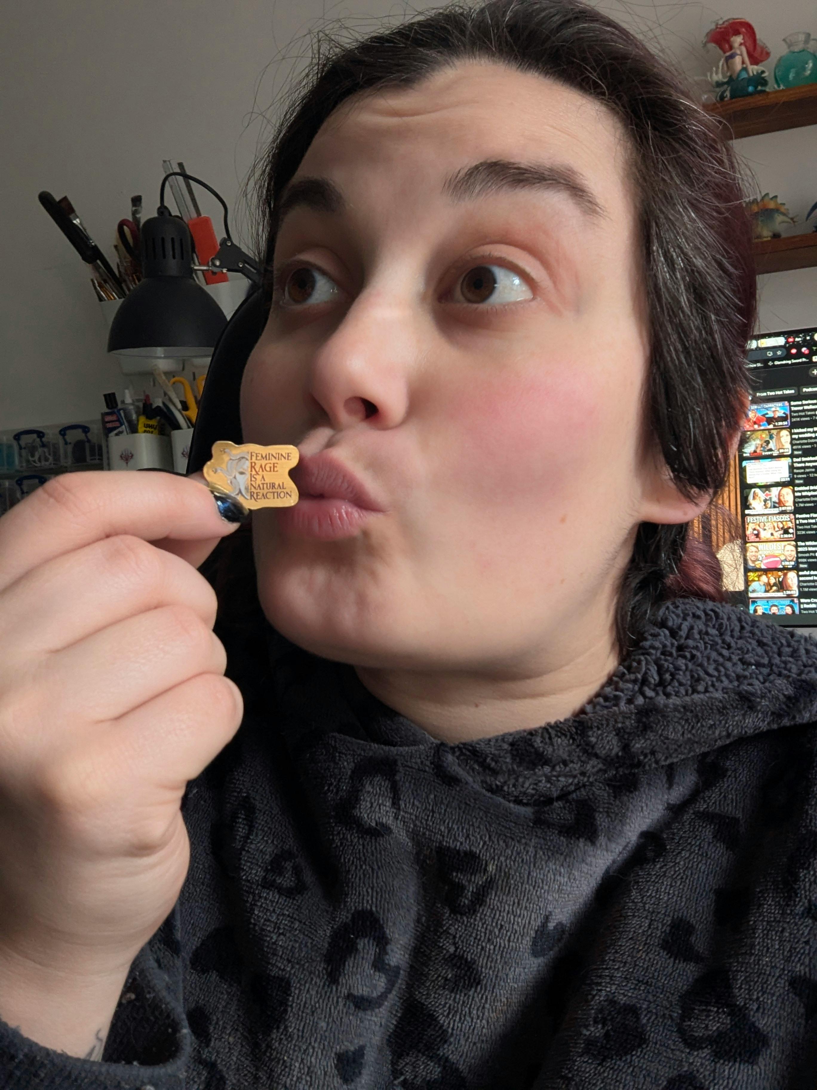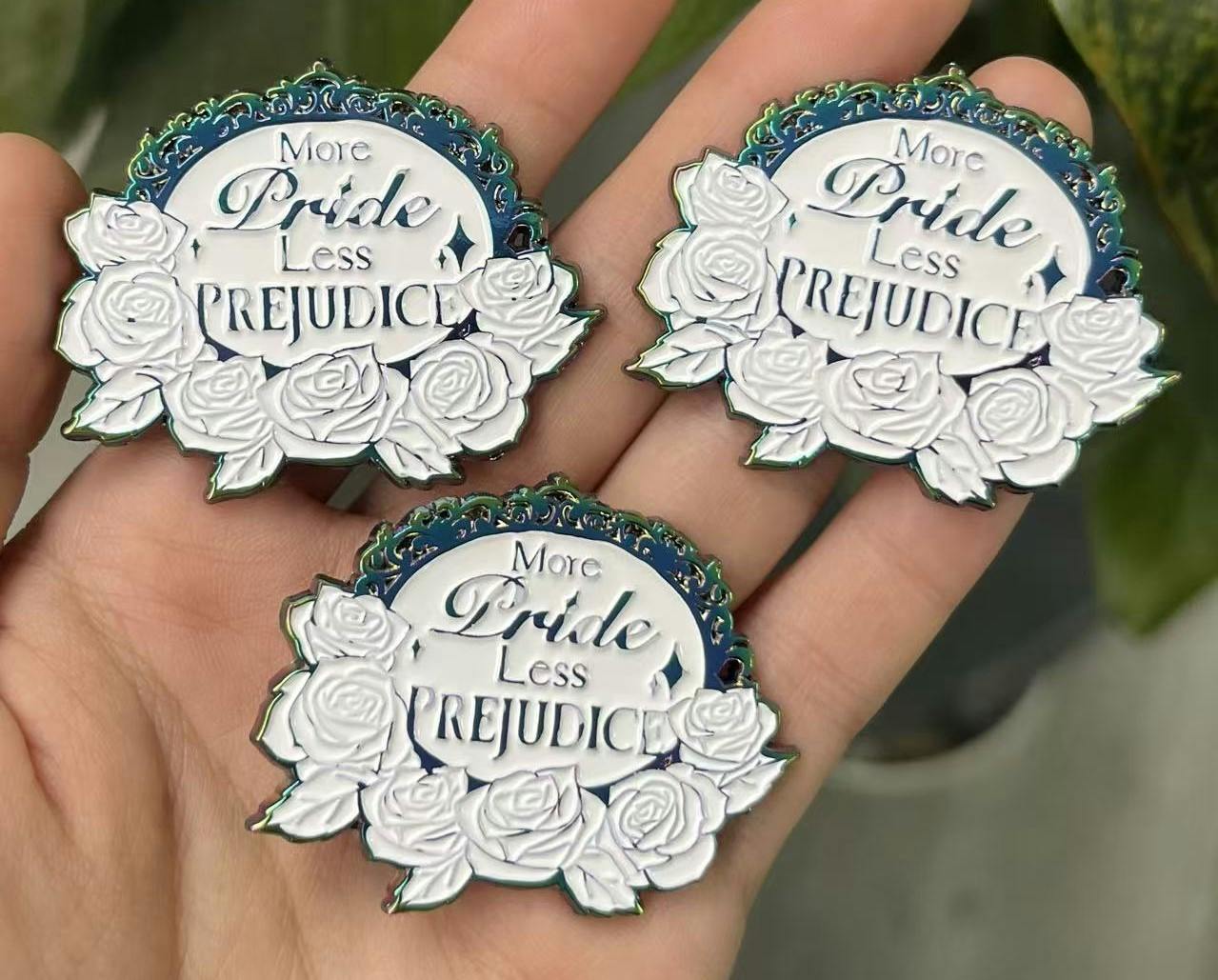 Third, the "more pride less prejudice" pin needed to be remade! It just didnt look great with the initial colours, and i asked my manufacturer to remake the plating to be more colorful. I also asked him to change the original enamel infill and reduce it so its only on the letters and not on the flowers.