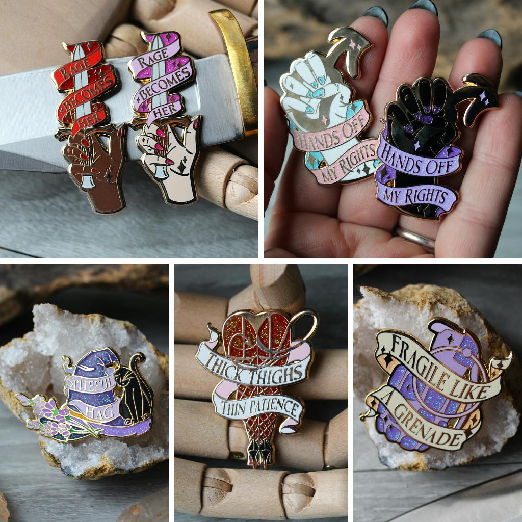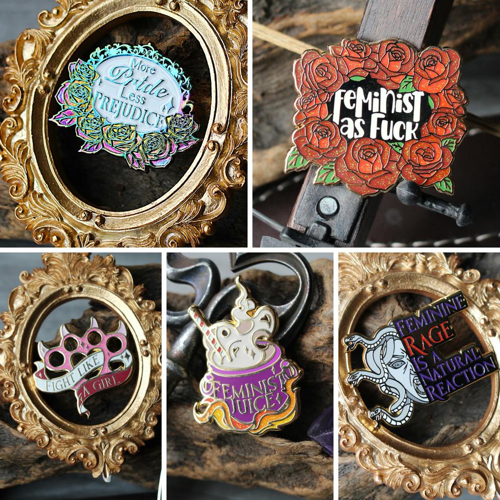 All the new designs are now in hand, and i took some photos for you- they're not as great as i hoped because theres no sun around here at the moment, but im SO happy with how everything turned out, including the much-revised More Pride Less Prejudice pin which now looks appropriately rainbow plated!