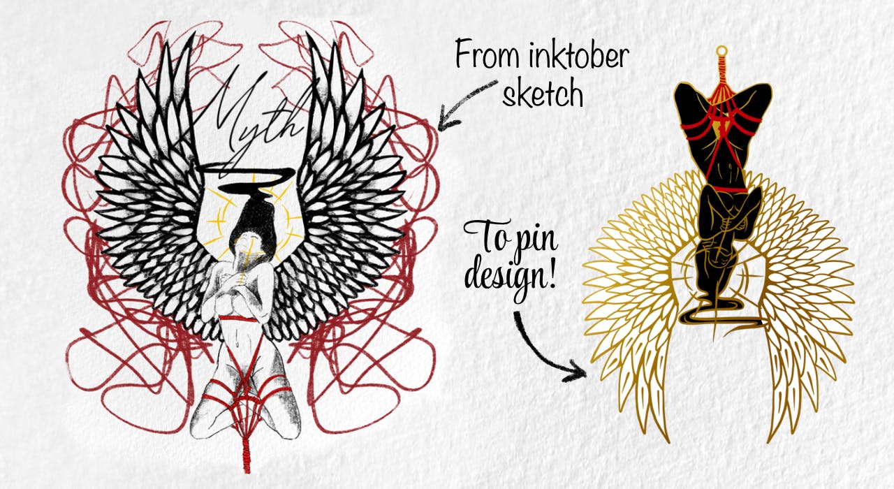 This is a very vulnerable part of me to share with you- although i've been a rigger for quite a while, my shibari art is not something i ever shared publicly because of the stigma it still faces. For me Shibari is a way of practicing mindfulness, of learning my limits and developing connections. It fosters better communication and has broadened my horizons, allowing me to meet a very wide variety of people! Its a very different style from my usual art, although it keeps the same themes, with Fantasy at the forefront. Most of the pin designs use photos taken by myself as references for the sketches, only with a fantastic twist, and although i was bound to show these off sooner or later, i felt pintopia was the kick in the butt i needed to get this project moving! I started building the designs during this years’ October drawing challenge, and the project idea took root there.