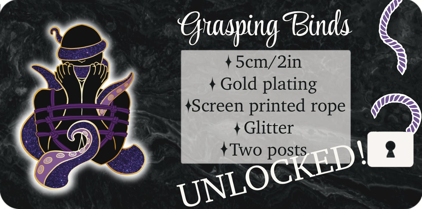Grasping binds started as an illustration for the prompt “fisherman”. The tie represented is called a fisherman harness, so it was a silly joke that evolved to represent the fisherman’s capture. This pin will feature glitter in the tentacles and screen printed ropes.