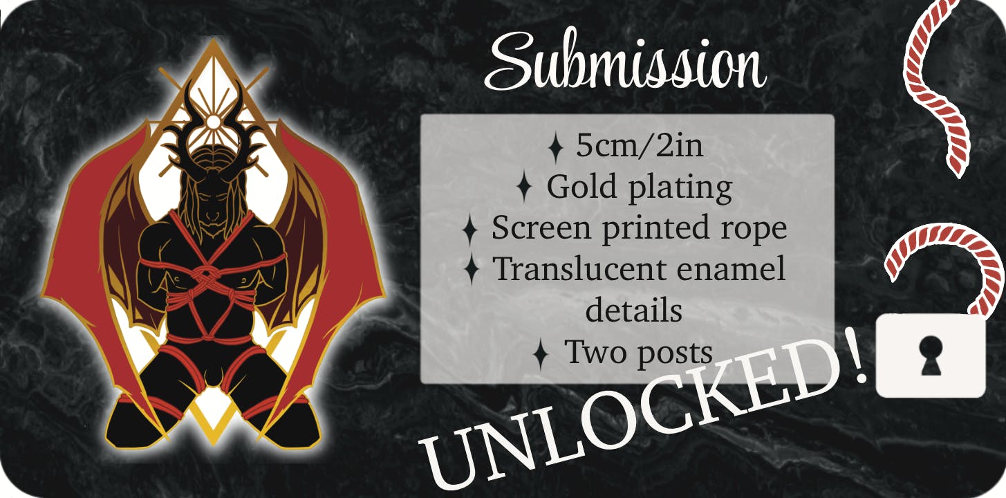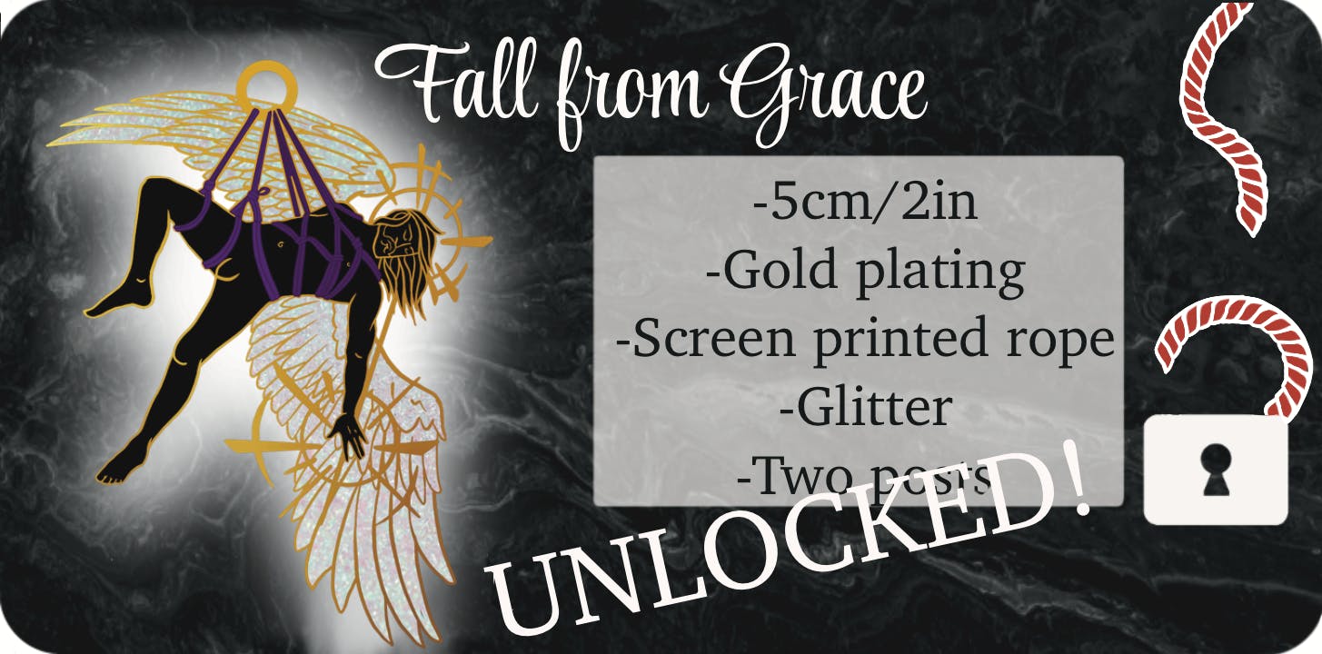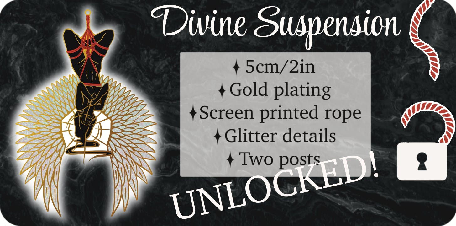 Divine suspension was one of my favourite sketches starting this campaign! It features a very challenging tie, and I thought it was fitting to give it feathered wings. This pin will measure 5cm, and feature glitter in the feathers. The rope itself will be screen printed on for higher detail at such a small size.
