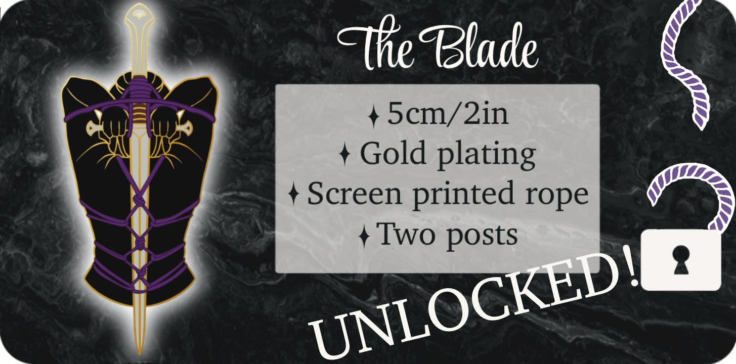 The Blade represents me! I imagined this tie after I saw a lord of the rings themed challenge, and used a sword from my own collection to make it happen, asking my partner to tie it on me for reference! This pin will feature screen printed ropes, and the design may change as the campaign proceeds, since I’m not completely happy with it.