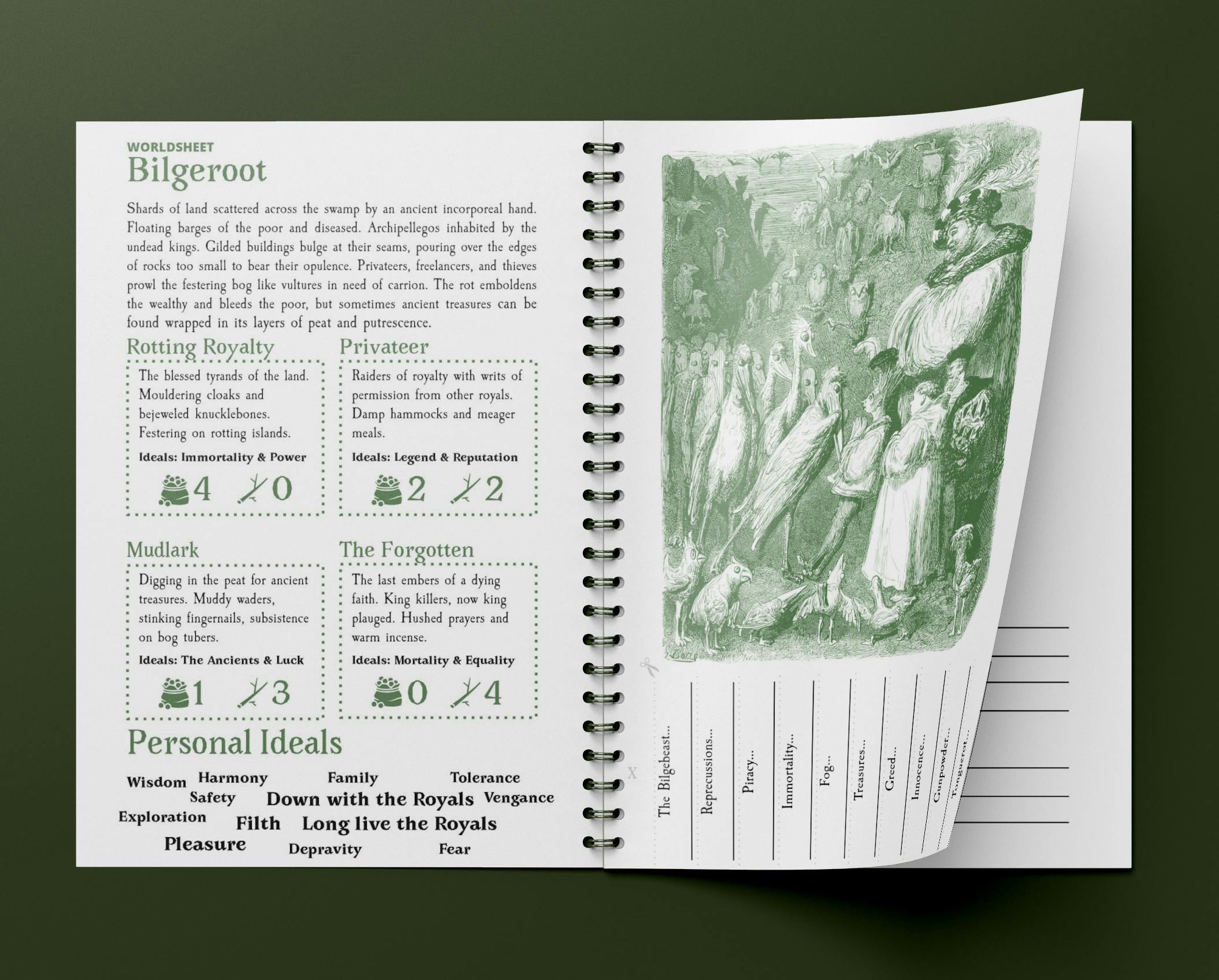 Play is centered on Worldsheets, 2 page spreads describing the foundations of a setting, its prominent factions, the ideals held by its denizens, and the themes of the stories you'll tell in that world. It takes just a minute to read a Worldsheet, and they contain everything you need to start playing in a new world, be that a rotting archipelago or an icy space station. The base game will contain 12 Worldsheets including 5 from guest writers. More guest writers and Worldsheets will be added to the game if stretch goals are funded!