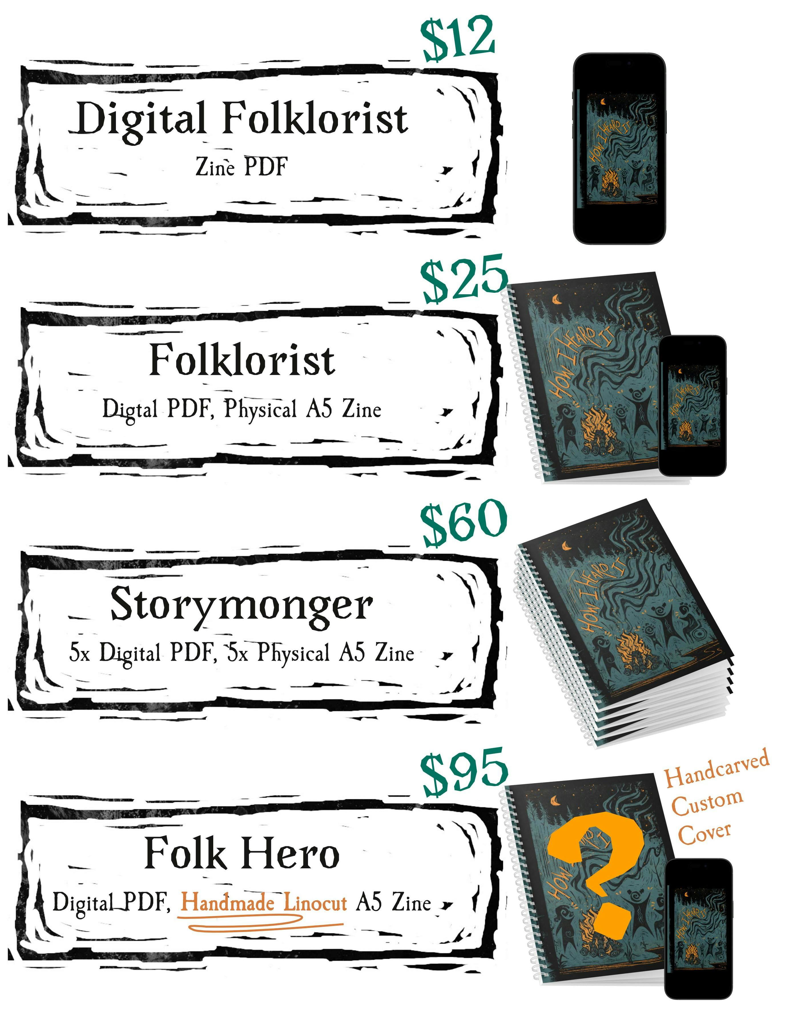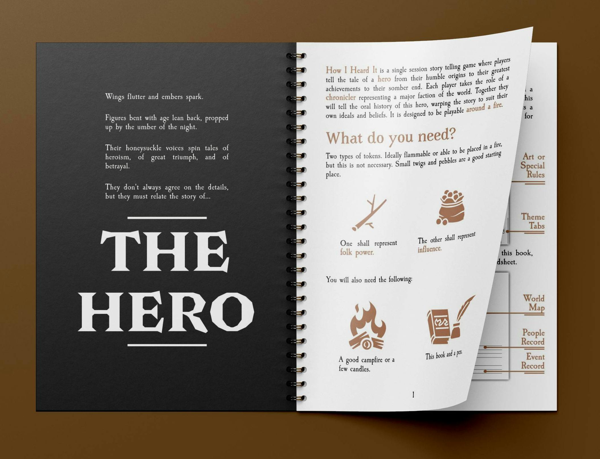 How I Heard It is a GM-Less storytelling game designed to be playable around a campfire. Work together with 3-6 friends to collaboratively tell the story of a folk hero: starting from their humble origin, to their great deeds, to their somber end.