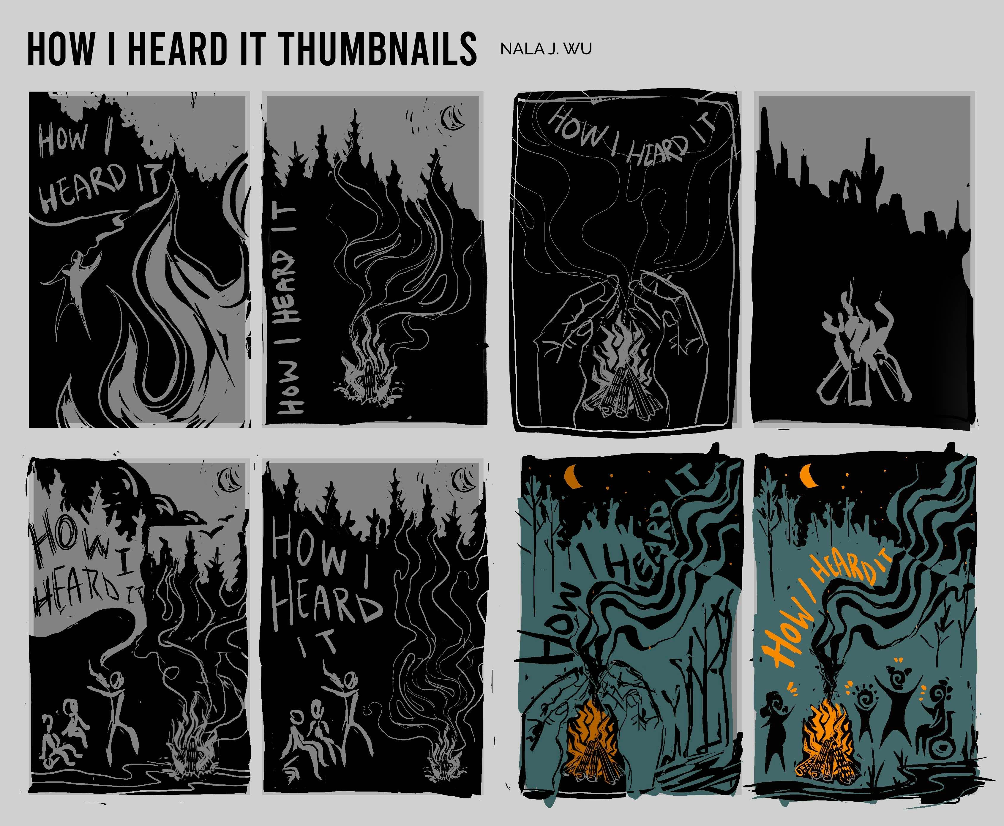 The thumbnails Nala created as we explored different directions for the cover to go in. We experimented a lot with different compositions to focus the campfire and storytelling elements.