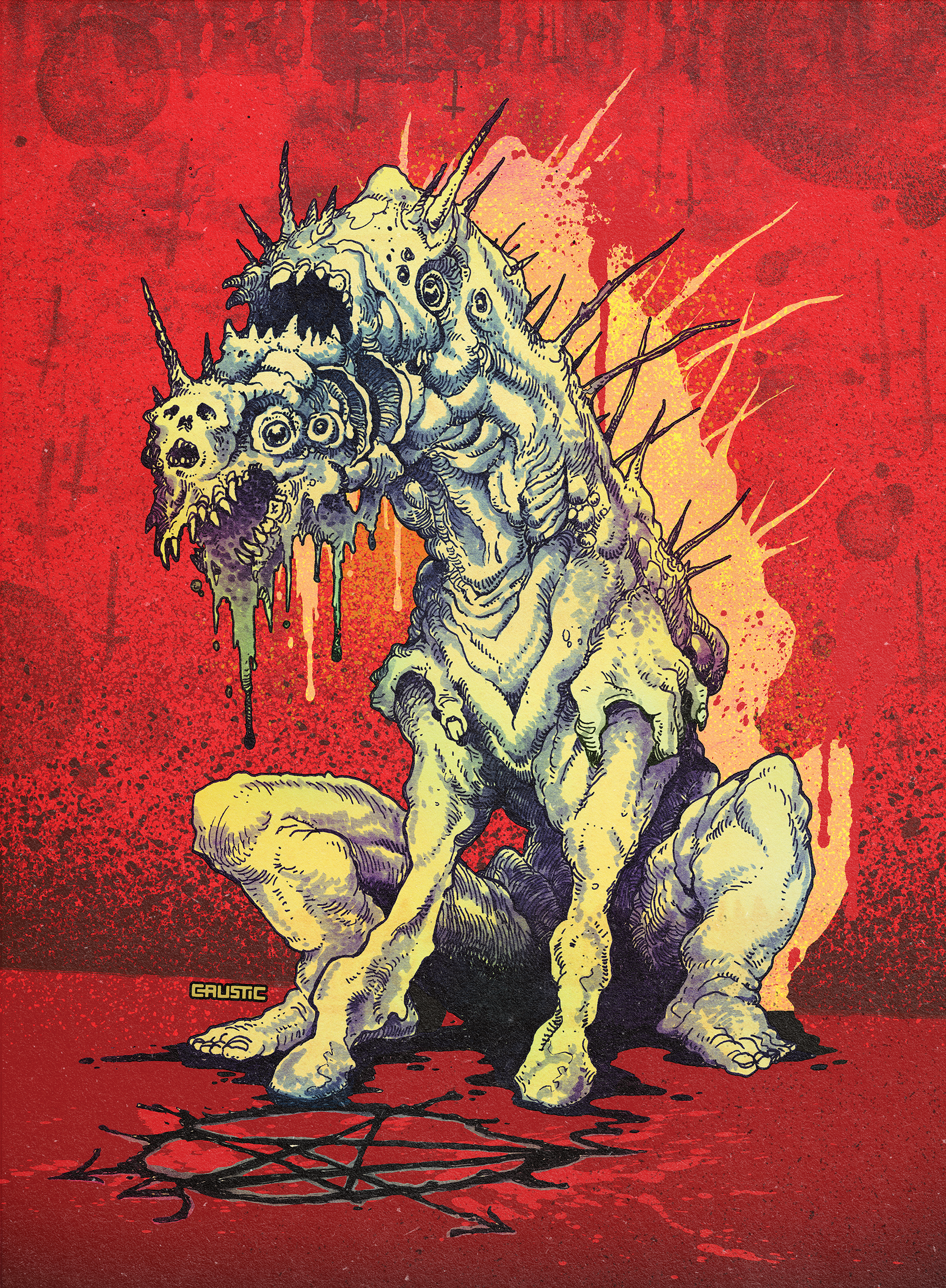 Next stretch goal — $22K: Even More Art by Caustic! When we saw this first illustration that Caustic created for the book before launch, we knew that we were going to have to double-down if the project took off... No next up we'll be adding eight additional pages of grotesque content illustrated by Caustic to the digital and physical editions.