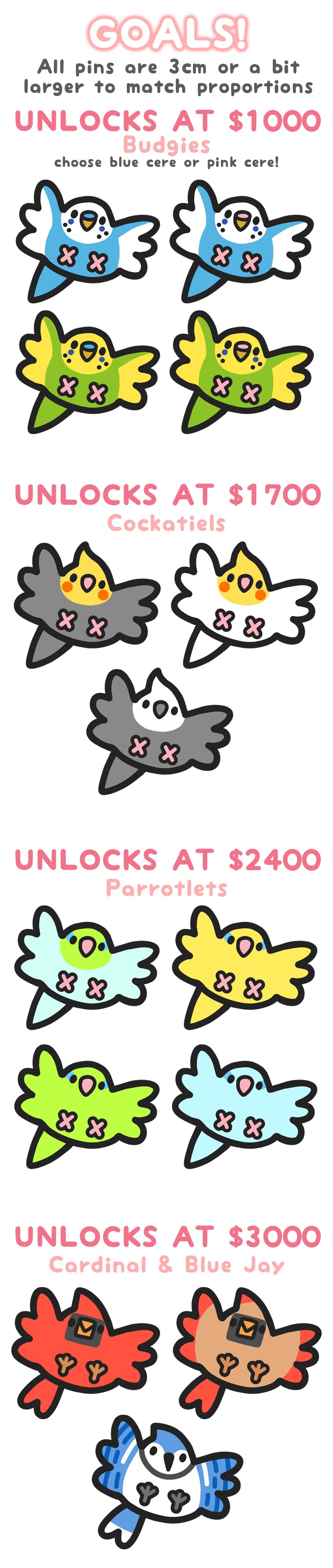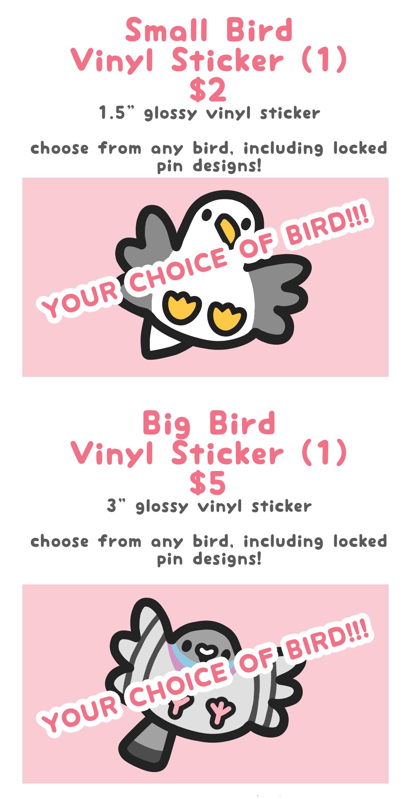 Big big birds! Enamel pins, stickers, and more featuring adorable birds. The flock will grow as the project goes on, pledge to make sure your favorite unlocks!