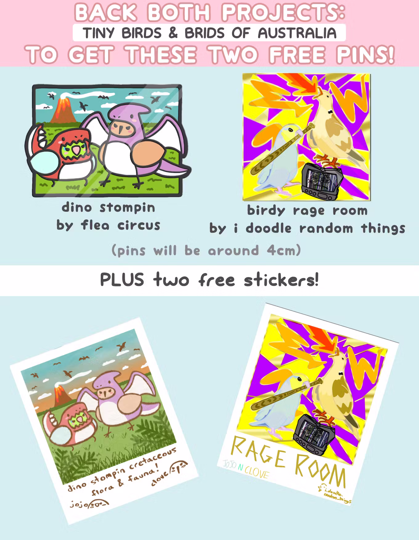 We're offering two free pins and two free stickers for backers of both of our projects!