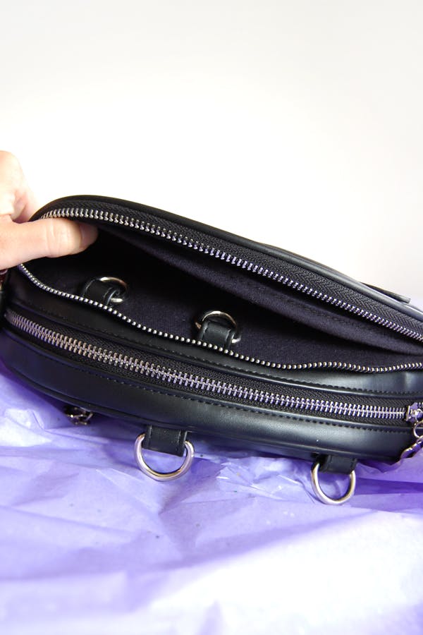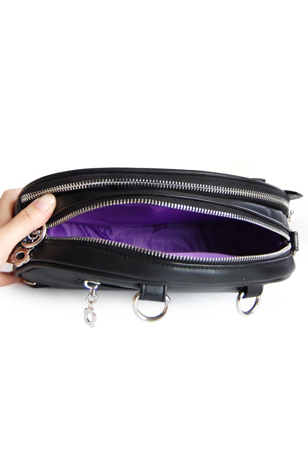 The big internal compartment has a separate zipper and is lined with black lining. There's also an additional zipper pocket on the back. Bag is made from faux leather and has a shoulder strap. Outer bag dimensions are 10.75 x 8.5 x 3 inches; internal pin window is approximately 7.25 x 5 inches in size. Forehead markings and eye are printed on the bag.