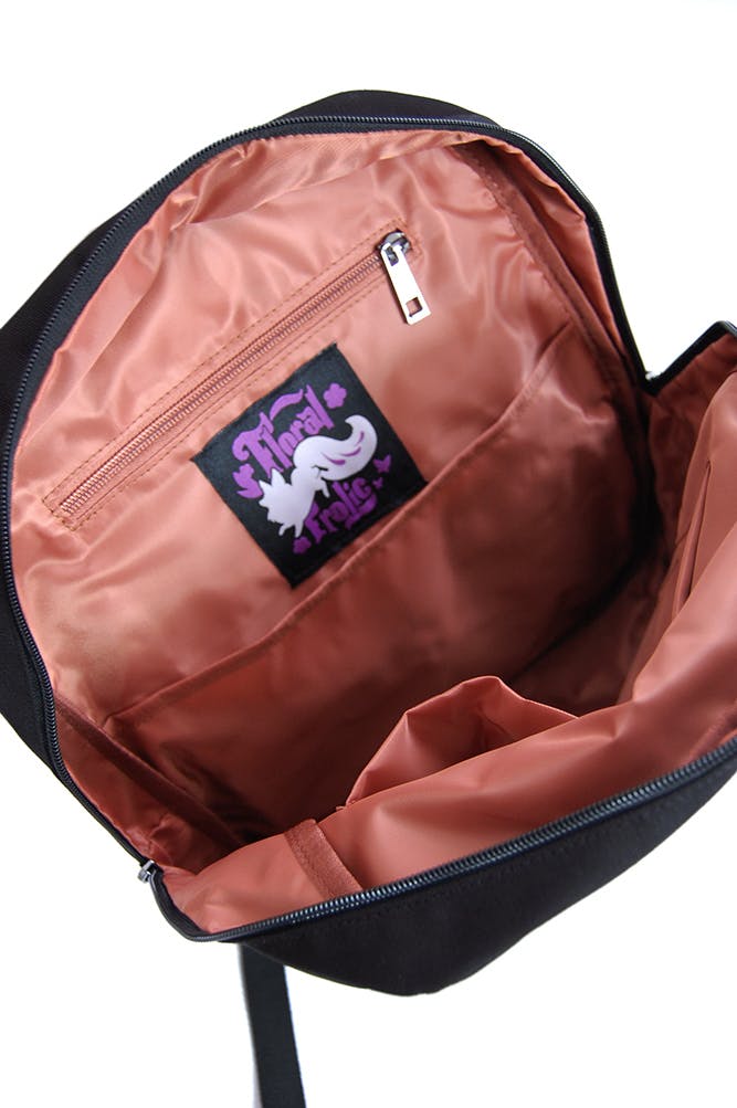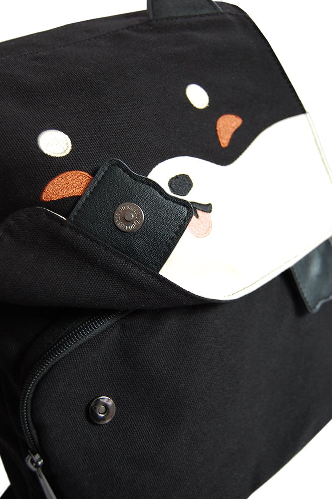 The flap front is held down by magnets under the paws. Under the flap, the bag has one big main pocket that's zippered, plus a front pocket. The interior is lined in a warm brown smooth fabric. The big interior pocket has a zipper compartment, plus sleeve pockets for your phone, wallet, and a work folder. There is a secret pocket on one side of the bag. The back of the bag is padded for comfort and has adjustable straps. Zippers have holes on the ends so you can even add a keychain yourself!