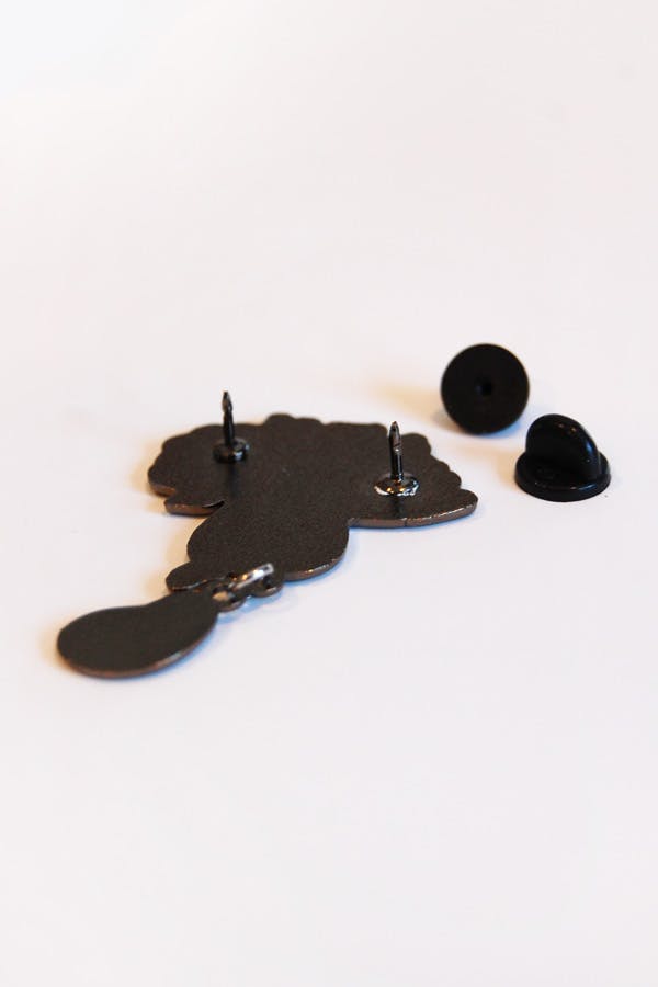 Ah yes we have arrived at the favorite part of every campaign. PINS. Our campaign pins featured here are all about 3 inches tall by 1.5 to 2ish inches wide. Some pins have dangles, some pins have glitter! They all have two posts on the back and come with rubber pin backs.