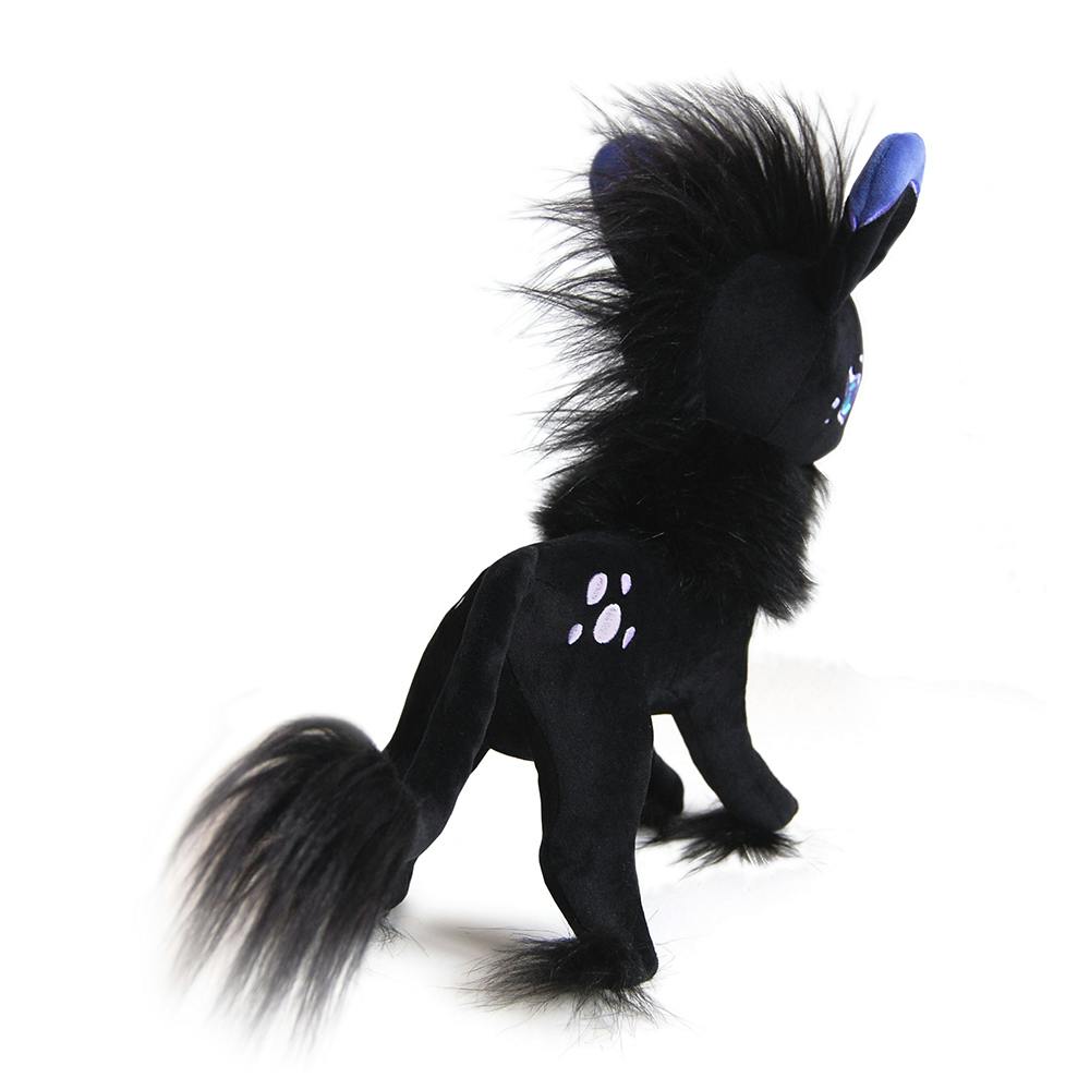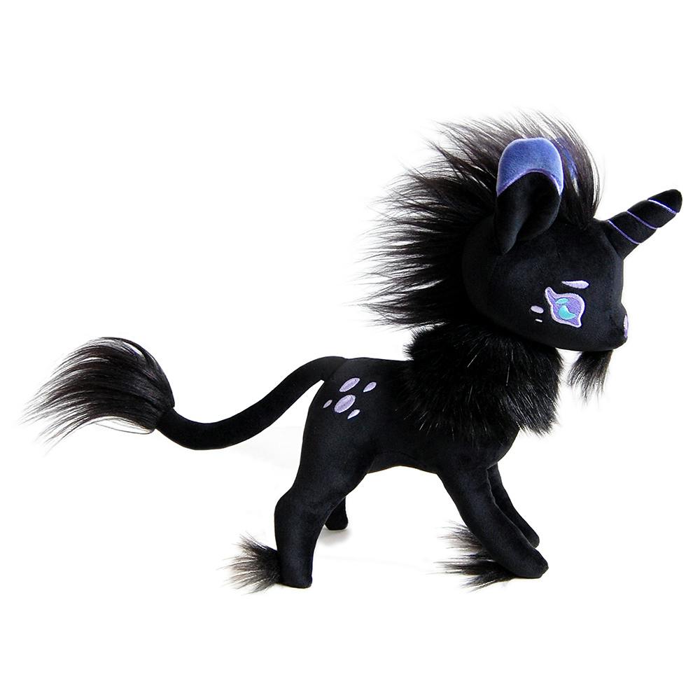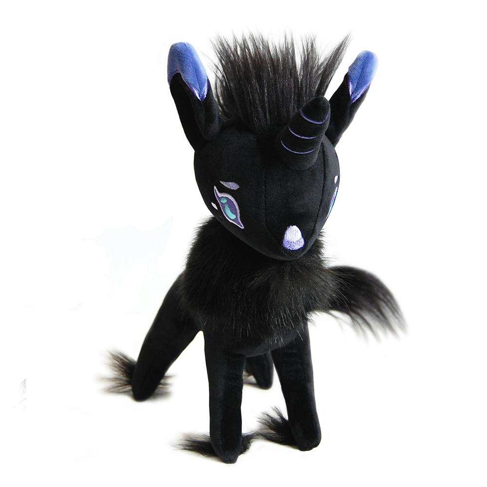 A soft black fuzzy horned friend! We designed a black unicorn plush based around all of our favorite unicorn parts- delicate tufts on her feet, a tufted tail, and most importantly- a little goat beard! If you look closely, she's even been sewn with small cloven hooves, as well as dapples on her rump and cheeks. Her horn has purple embroidery details. Goaticorn stands around 12 inches tall. Her body is about 6 inches from chest to haunches (not including tail).