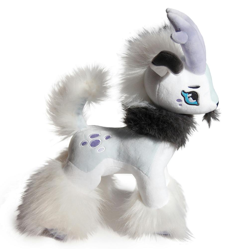Cute fluff around his hooves hides big chonky feet. He has thicker legs and feet than Black Goaticorn for plowing through snow! This prototype will have two changes made for the final production: the ice gray fabric on his nose will also appear behind his head and his tail will have more stuffing.