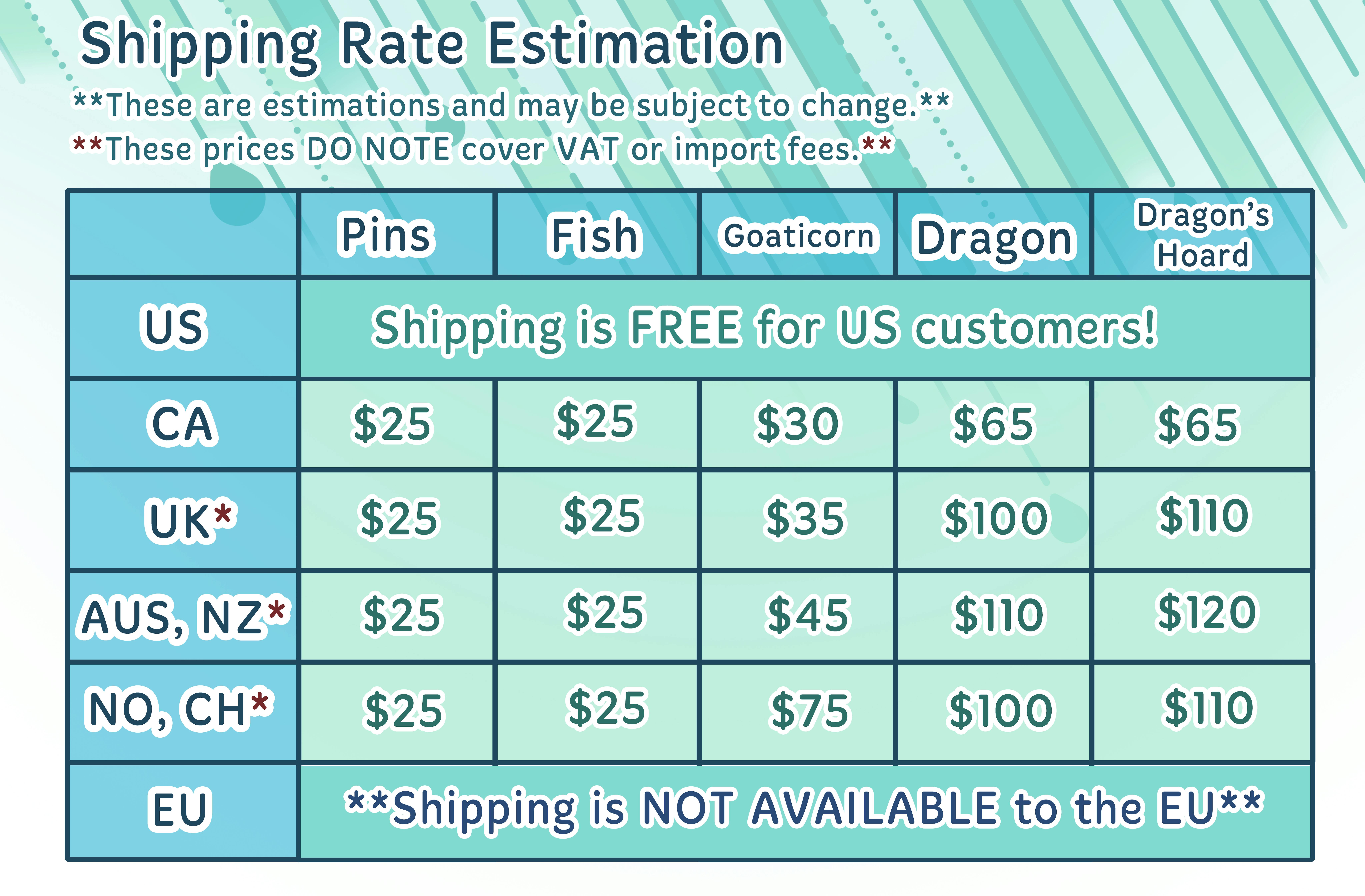 For non US customers, we have calculated a rough estimation of possible shipping rates. However, these are estimations, and shipping may increase depending on the rates of both USPS and UPS. For most orders, we will ship via USPS. For orders with large items (i.e. Rain Dragon plush), those orders may ship via UPS.