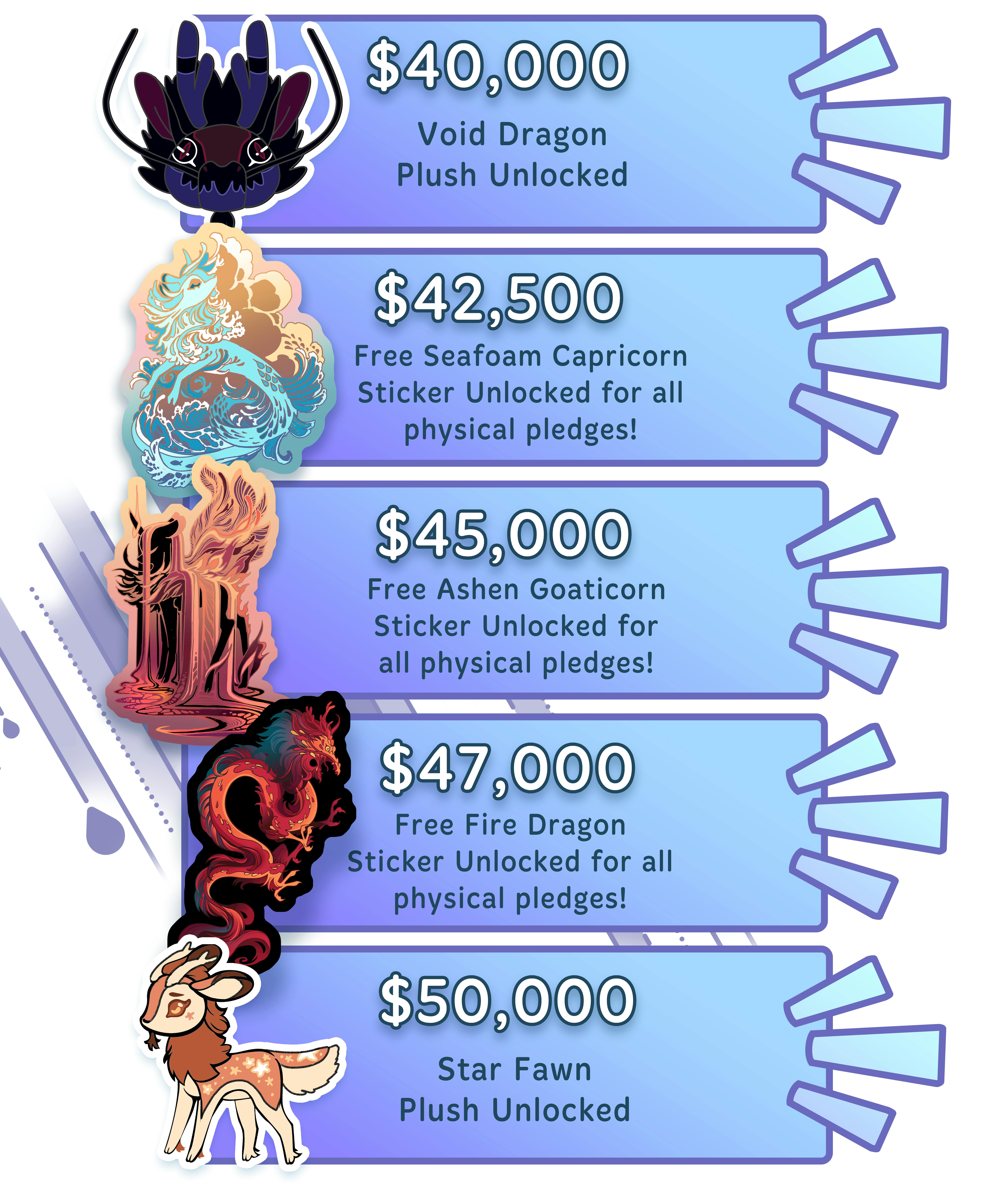 If we unlock some of the higher stretch goal plush, including Capricorn Goaticorn, Fawn Goaticorn, Gold Goaticorn, Void Dragon or Fire Dragon, the date for shipping will be pushed out until the end of the year. We hope to have everything ready to ship in time for Christmas Holiday 2026.