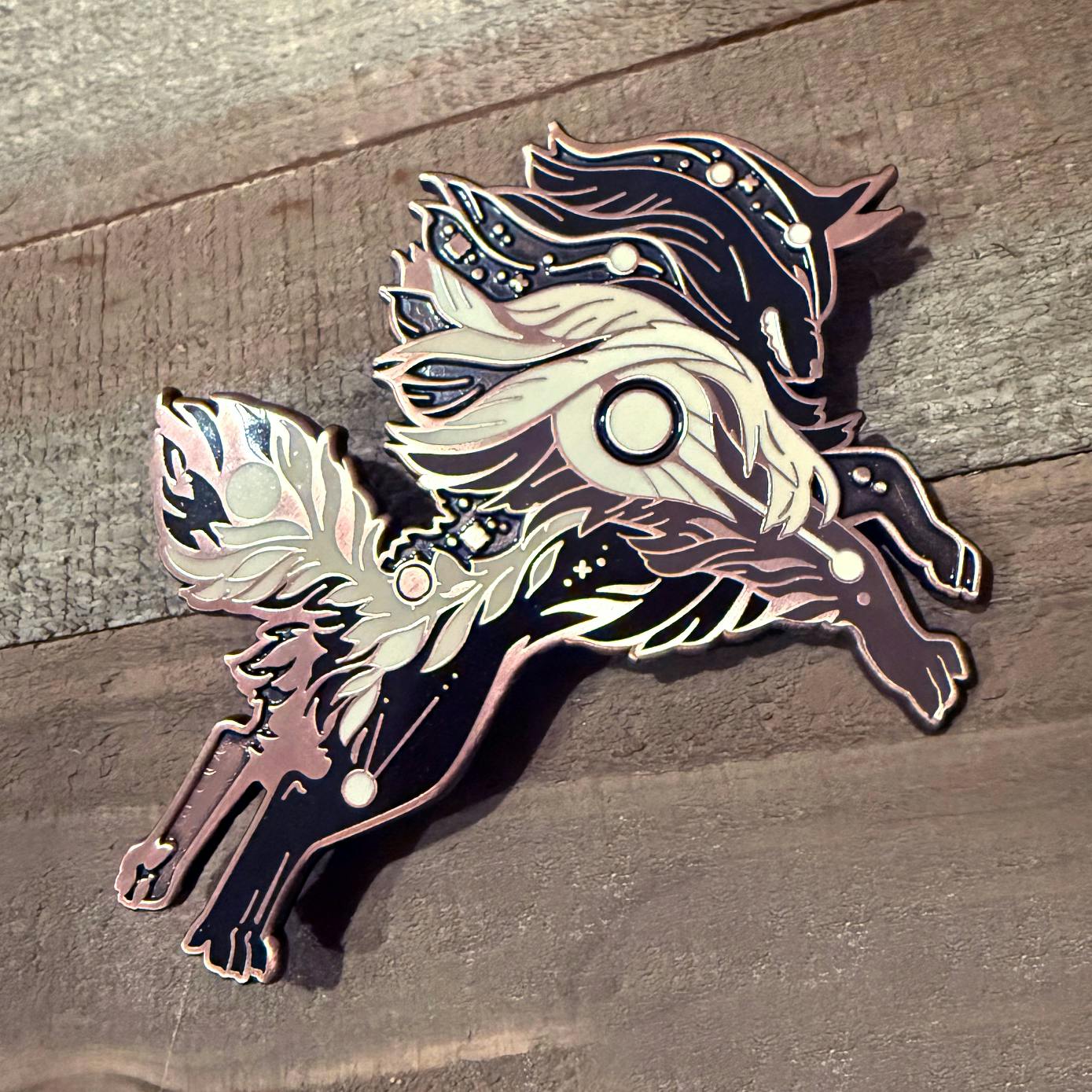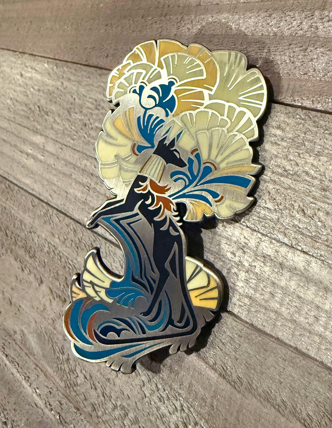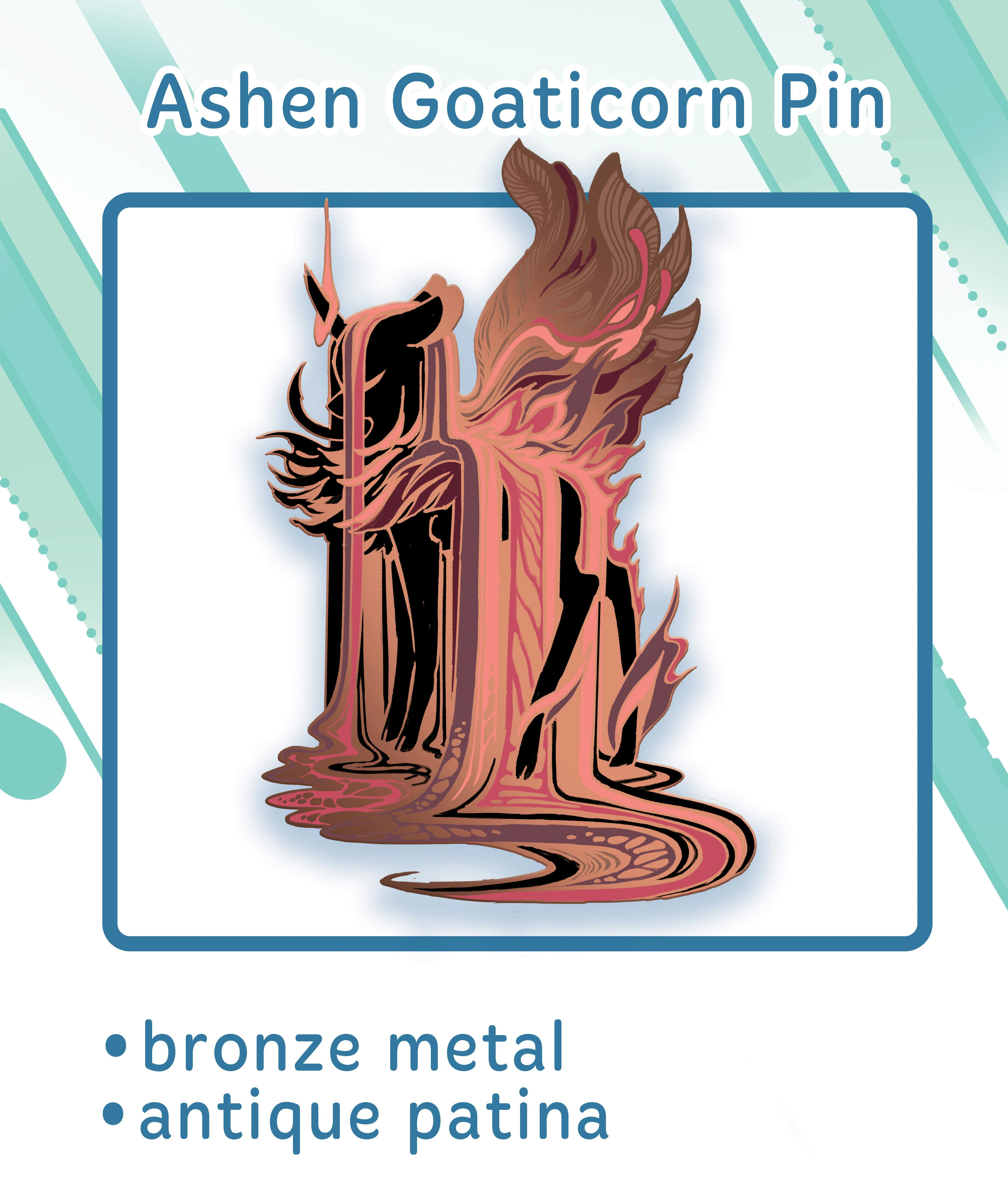 Since we are discussing pins, a picture of antique patina was requested in regards to the Ashen Goaticorn Pin. The antique patina is a brushed metal appearance with antiquing that turns recessed parts of the pin darker and makes it overall have a smoky appearance.