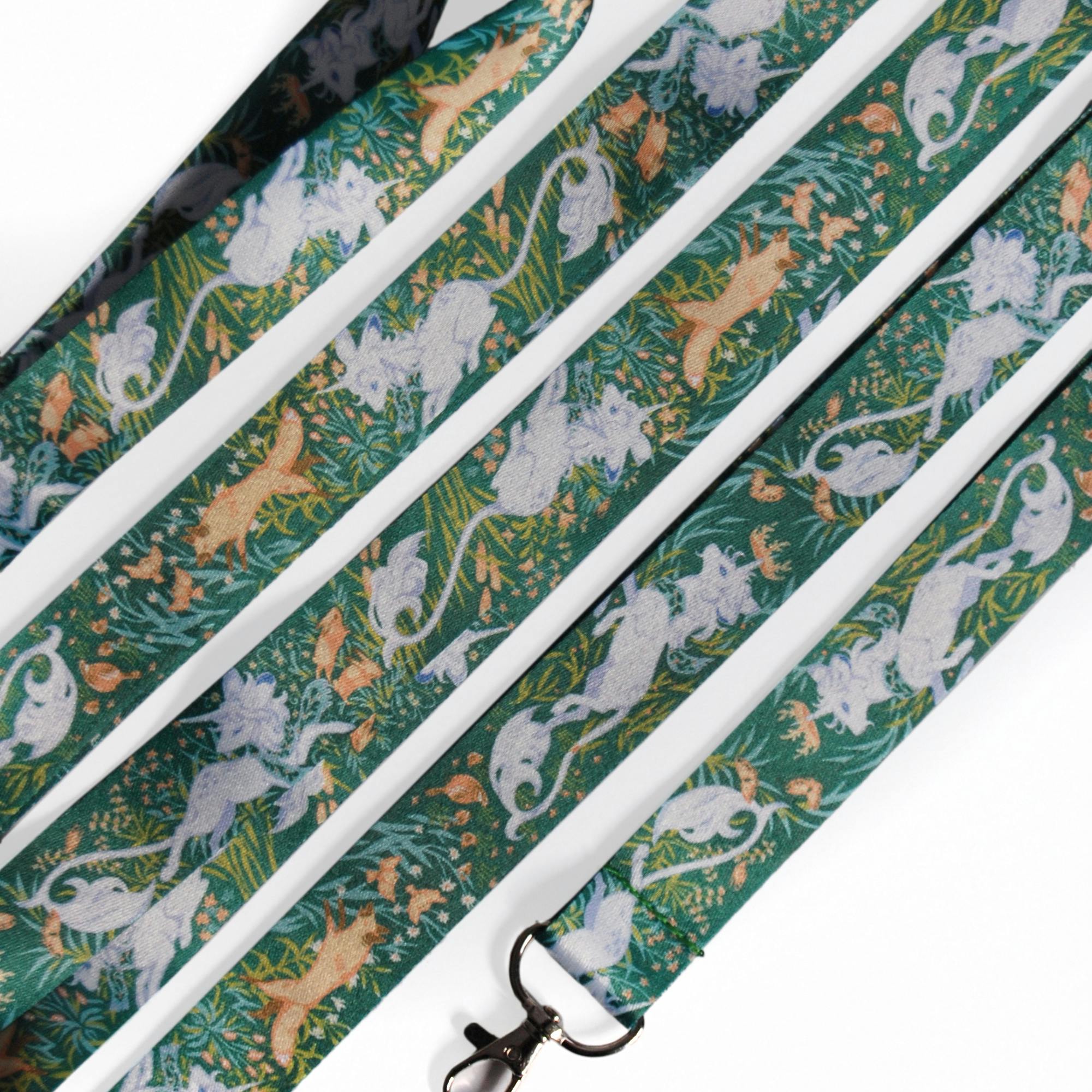 Lanyards are 1 inch wide and made from a polyester fabric. The end is finished in a lobster clasp which easily clips onto keys, ID cards or convention badges. This lanyard is about 30 inches in circumference, if measured from lobster clasp to base of lanyard, it is about 18 inches.