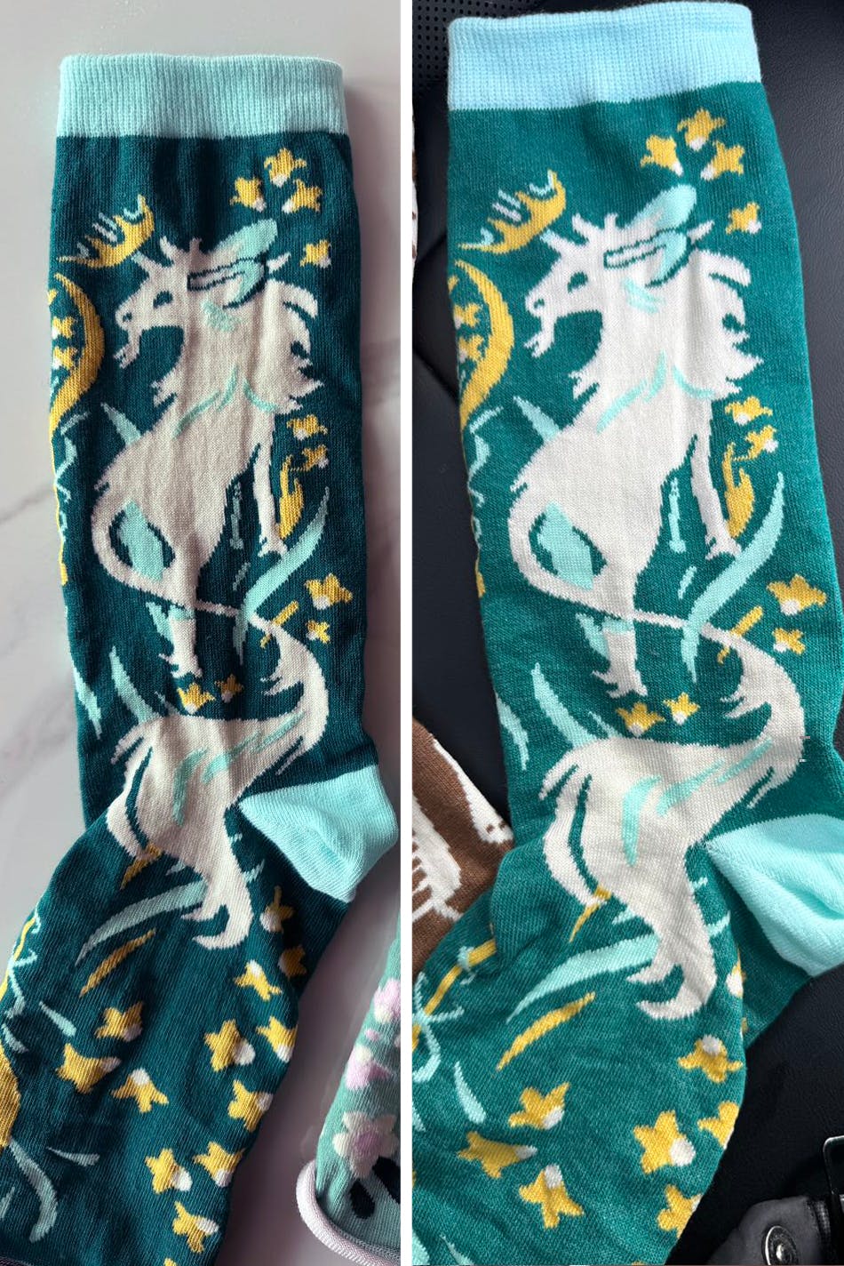 Here are really rough photos of the socks. Unfortunately, we won't have a look at the finished product until the order is complete. The color of material used on these samples is more accurate to the photo used in the add on section.