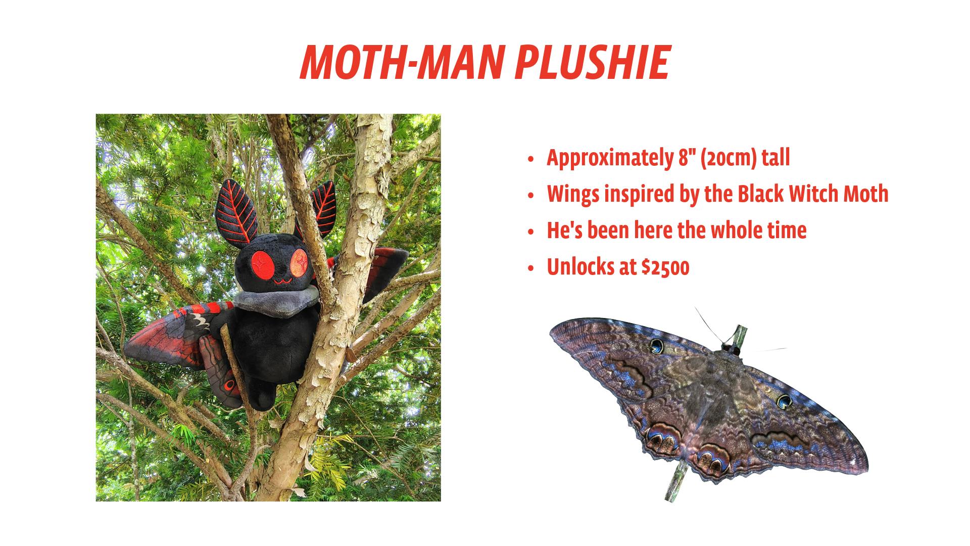 A 5" Mothman plush keychain with wings inspired by real-life moths! I'll also be offering a brand new mothman enamel pin. Alternate wing designs will also be offered as stretch goals.