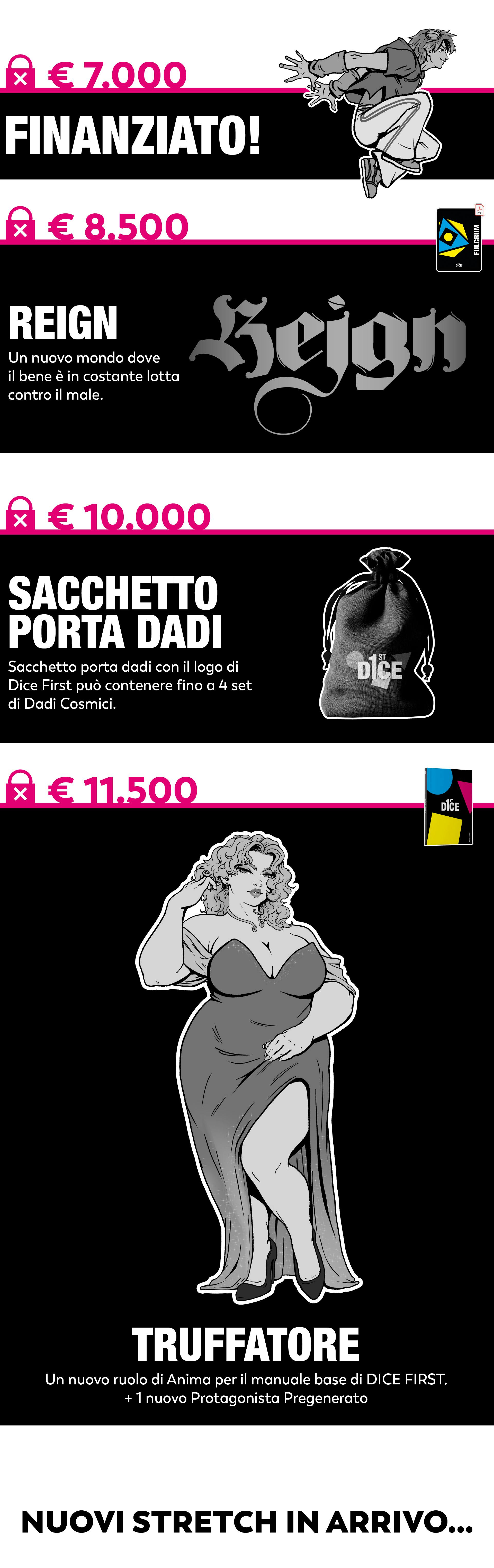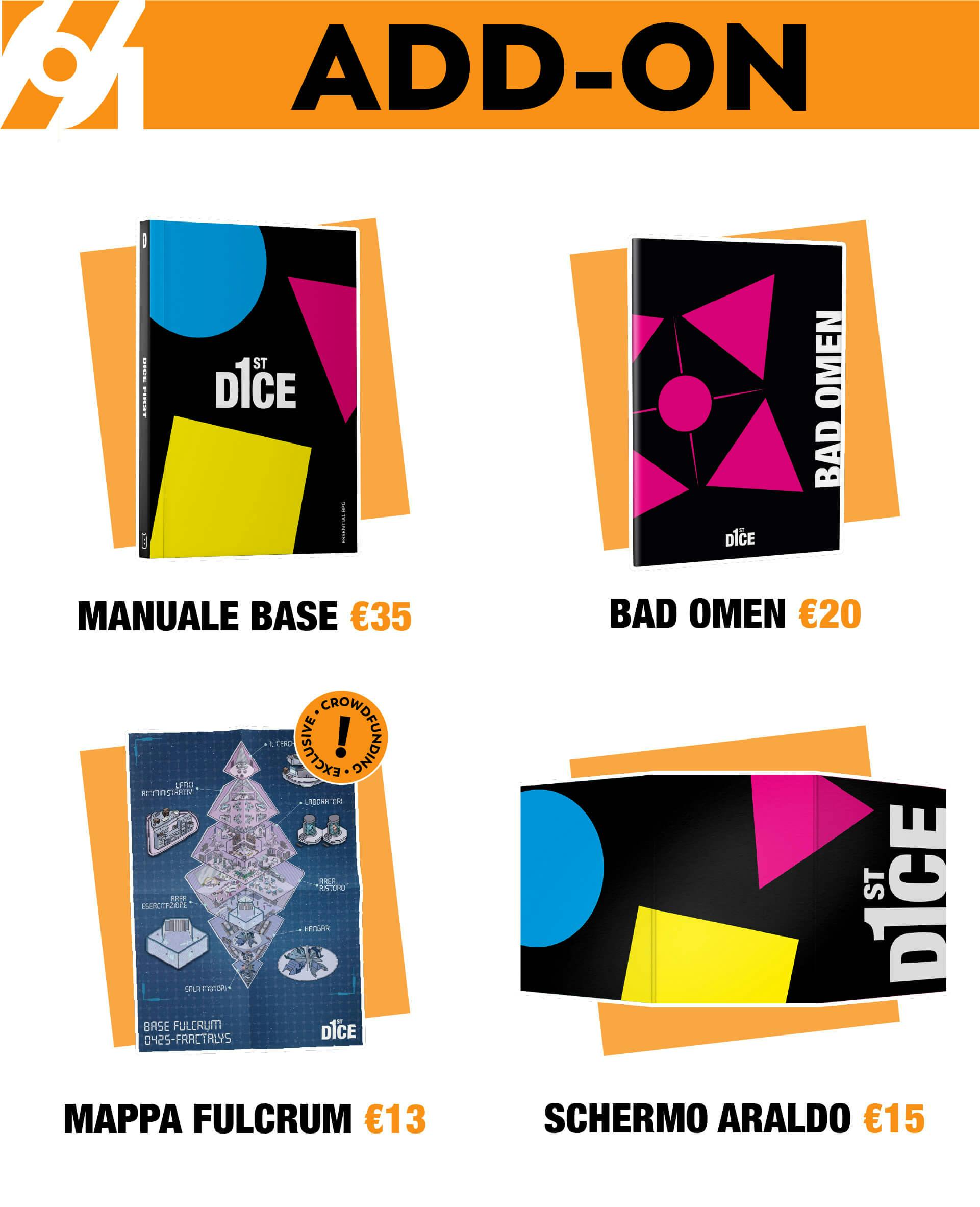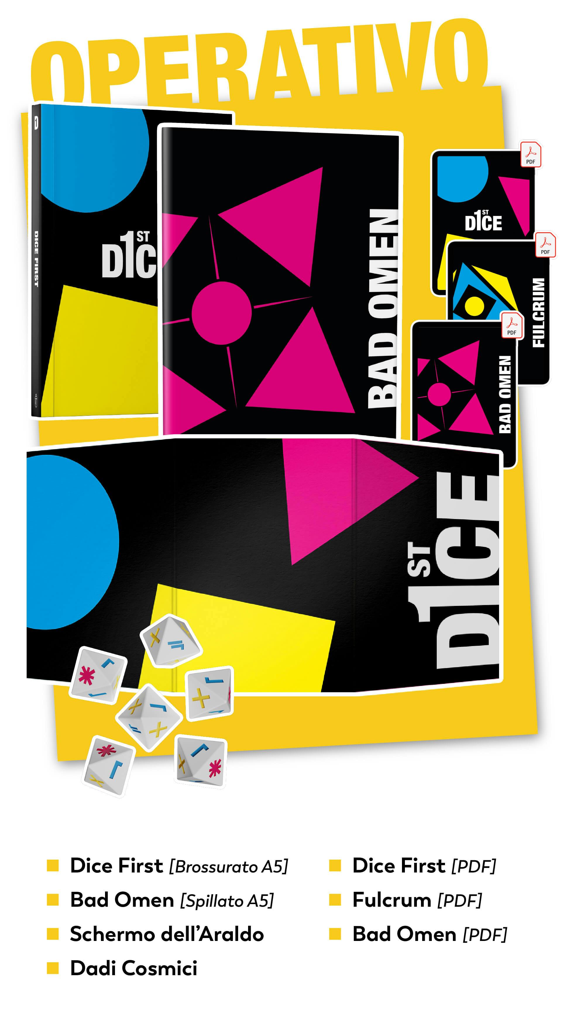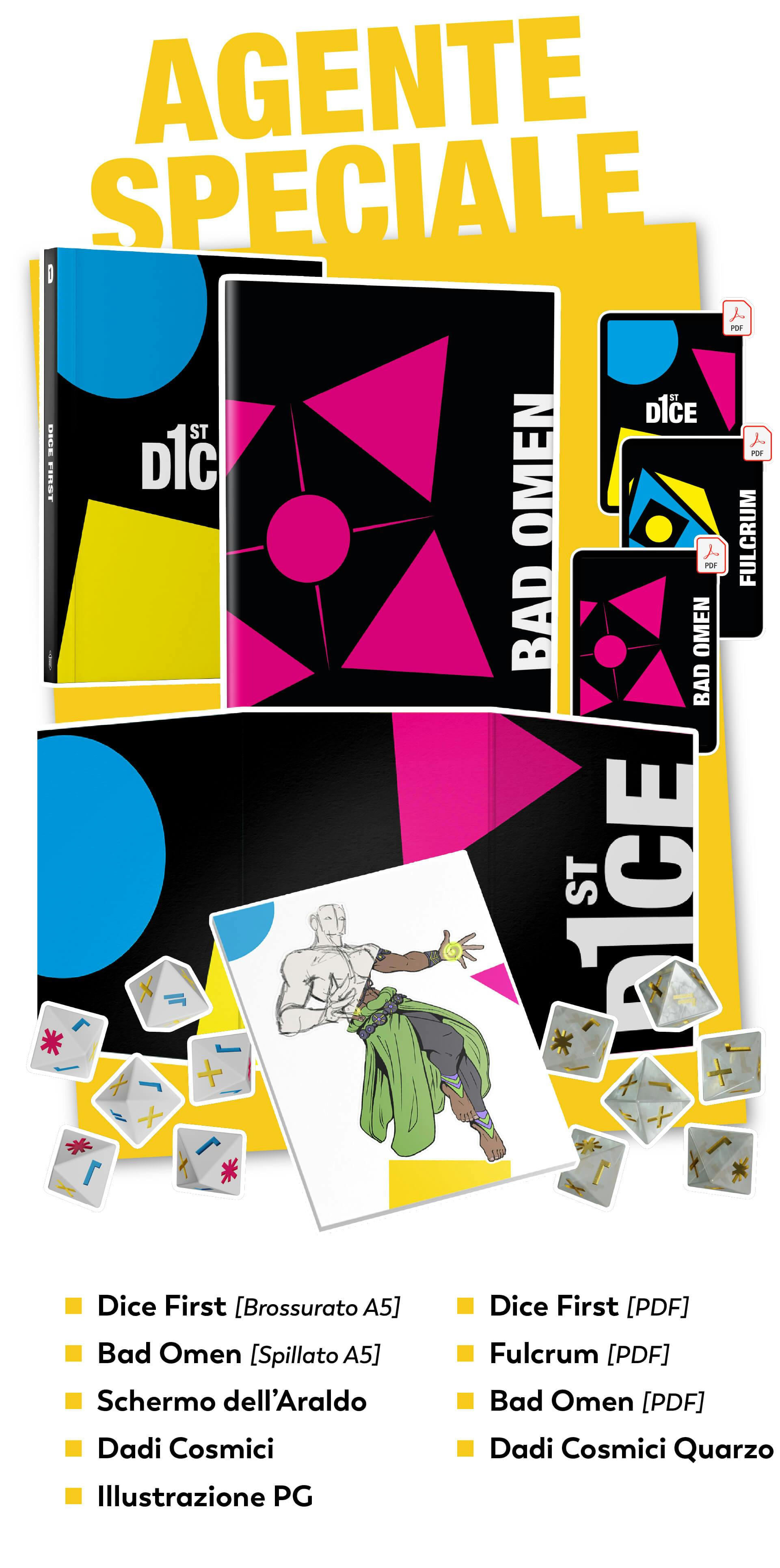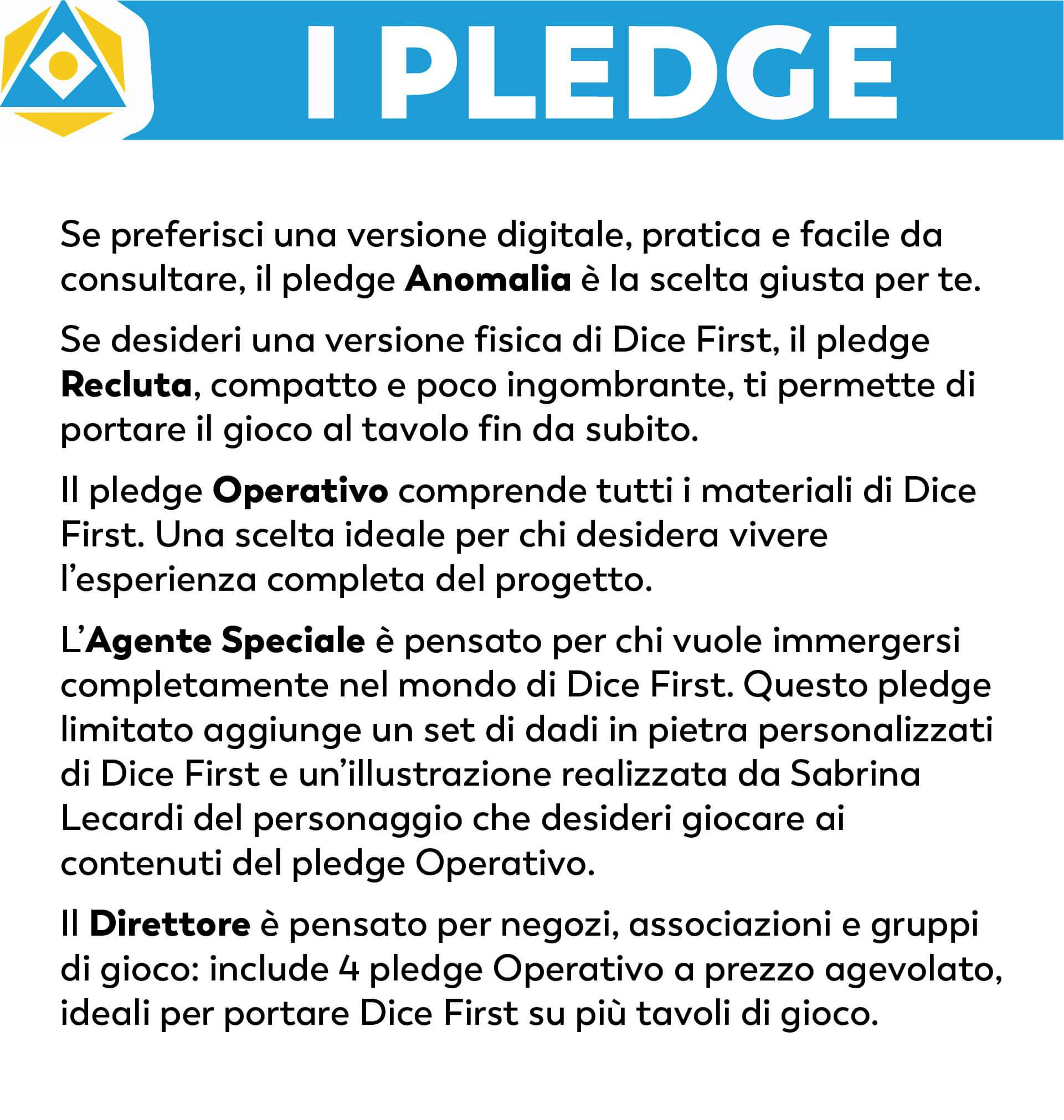 Il pledge Operativo comprende tutti i materiali di Dice First-Una scelta ideale per chi desidera vivere l’esperienza completa del progetto.