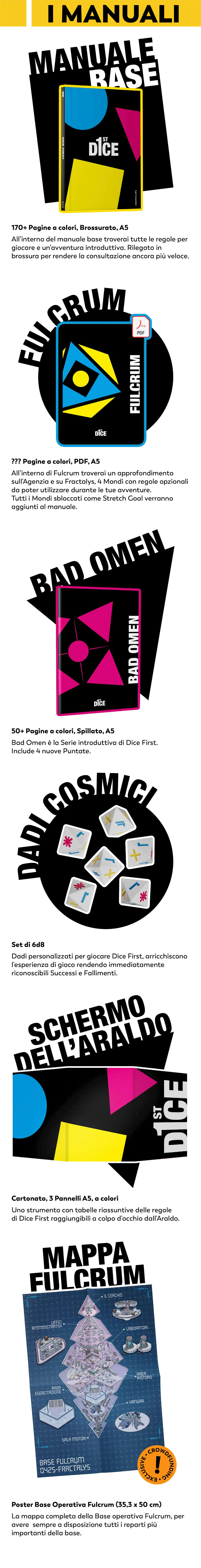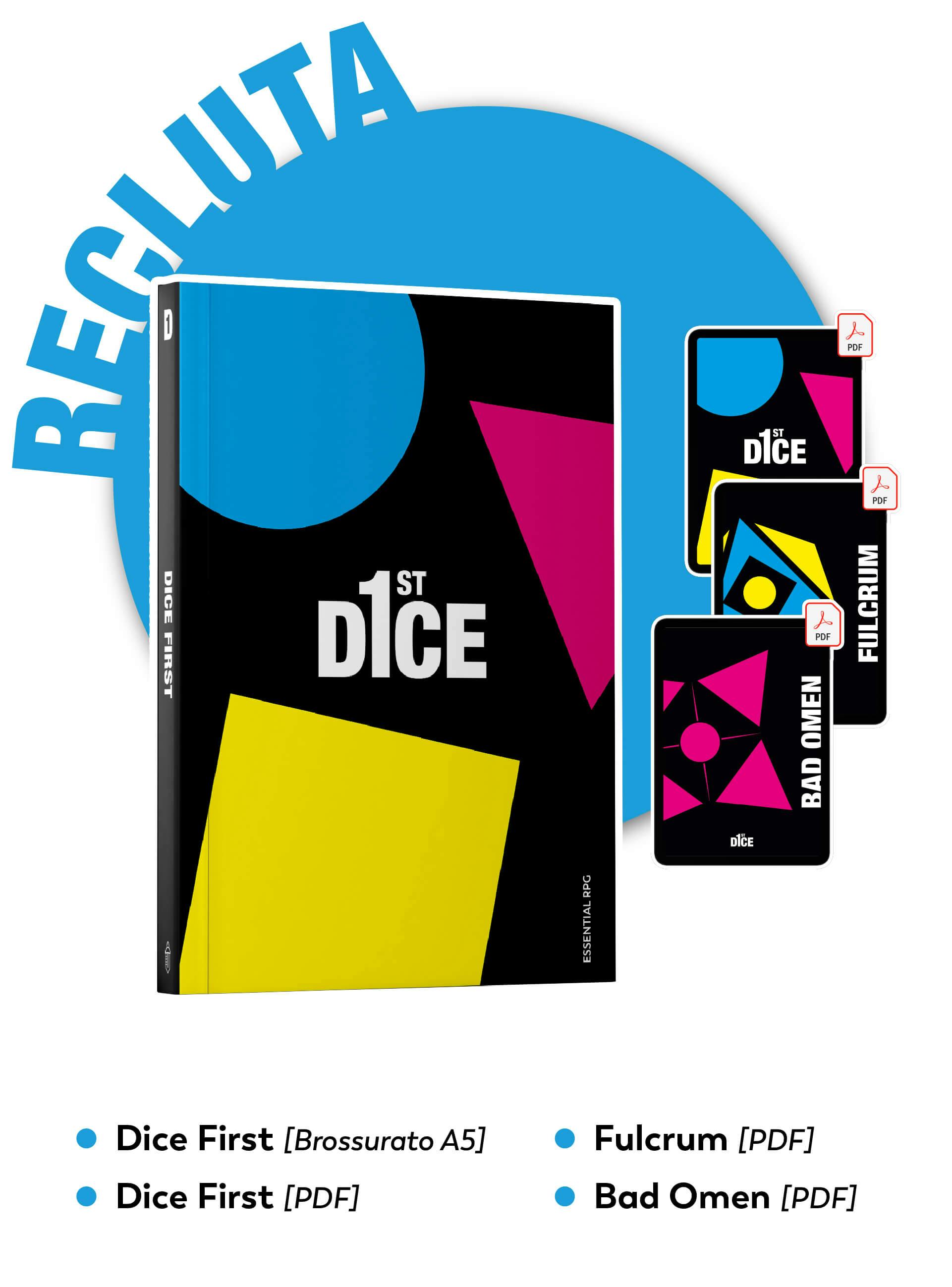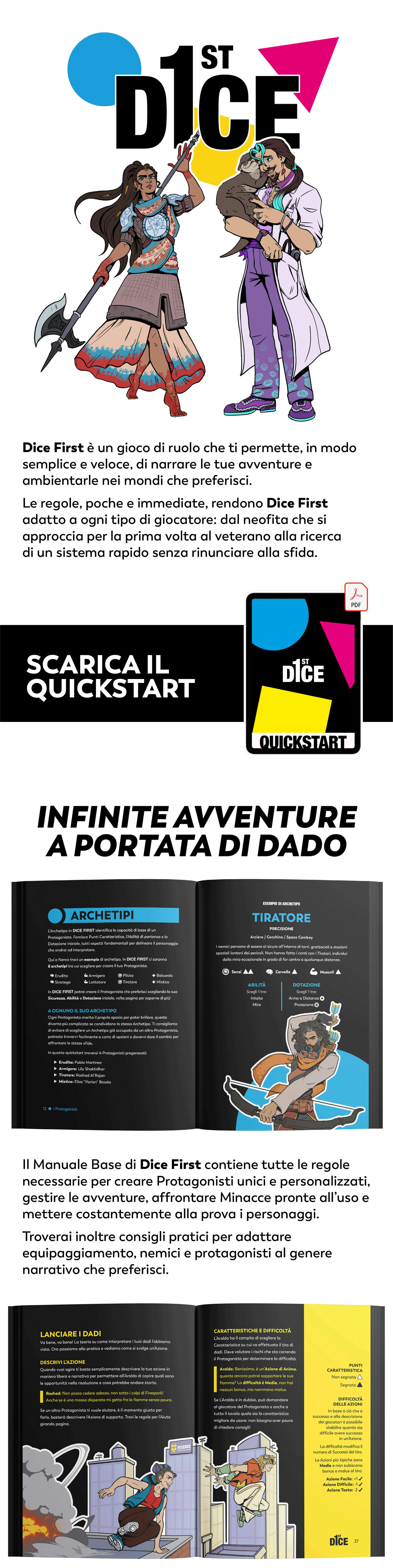 Il Manuale Base di Dice First contiene tutte le regole necessarie per creare Protagonisti unici e personalizzati, gestire le avventure, affrontare Minacce pronte all’uso e mettere costantemente alla prova i personaggi.