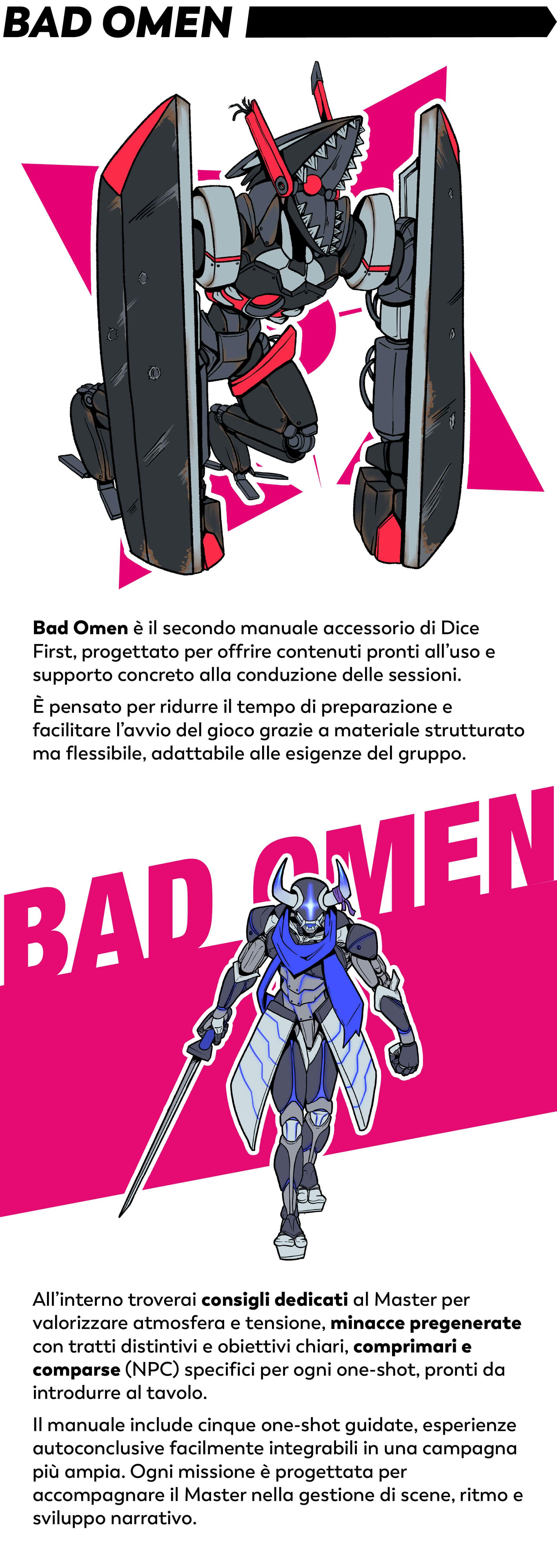 Bad Omen è il secondo manuale accessorio di Dice First, progettato per offrire contenuti pronti all’uso e supporto concreto alla conduzione delle sessioni.
