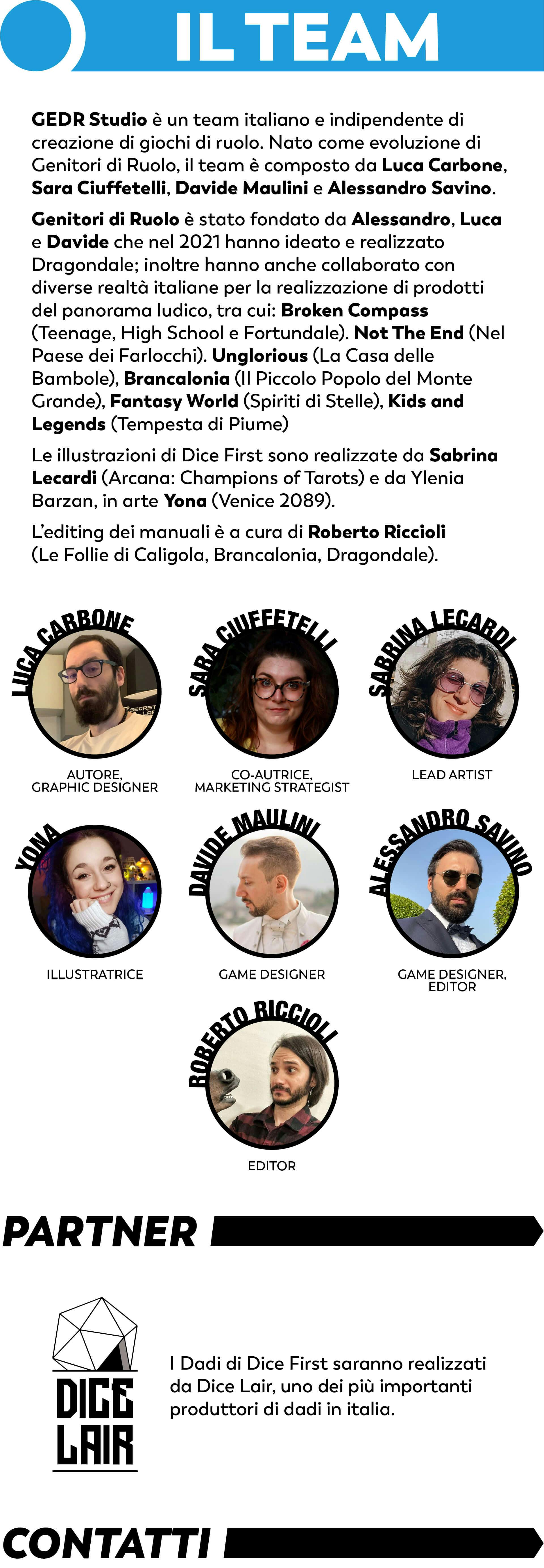 Dagli autori di Dragondale arriva Dice First: un gioco di ruolo narrativo semplice e immediato, con poche regole e infinite ambientazioni. Perfetto per neofiti e veterani, ti permette di vivere avventure rapide e coinvolgenti senza rinunciare alla sfida.