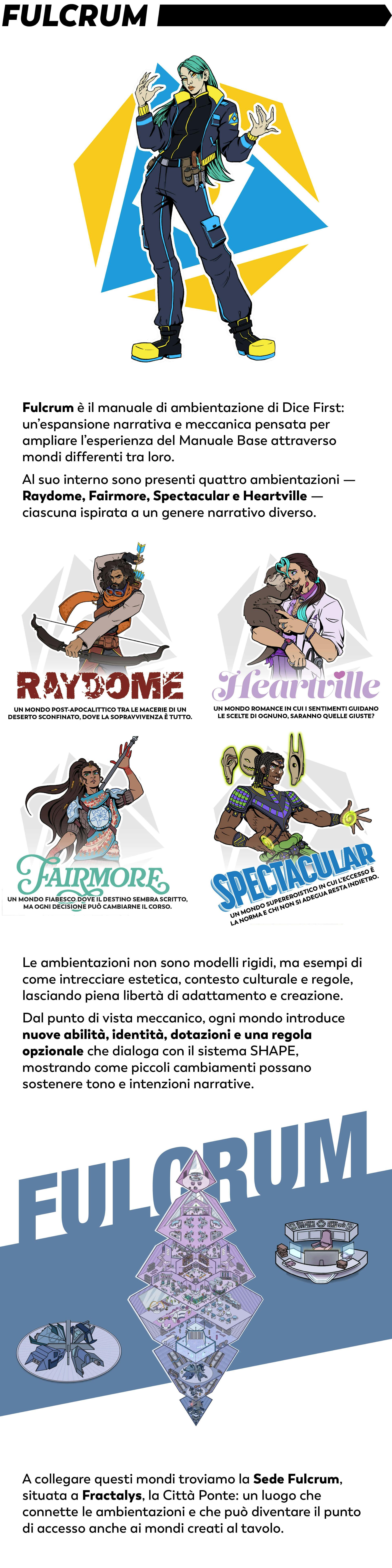 Fulcrum è il manuale di ambientazione di Dice First: un’espansione narrativa e meccanica pensata per ampliare l’esperienza del Manuale Base attraverso mondi differenti tra loro.