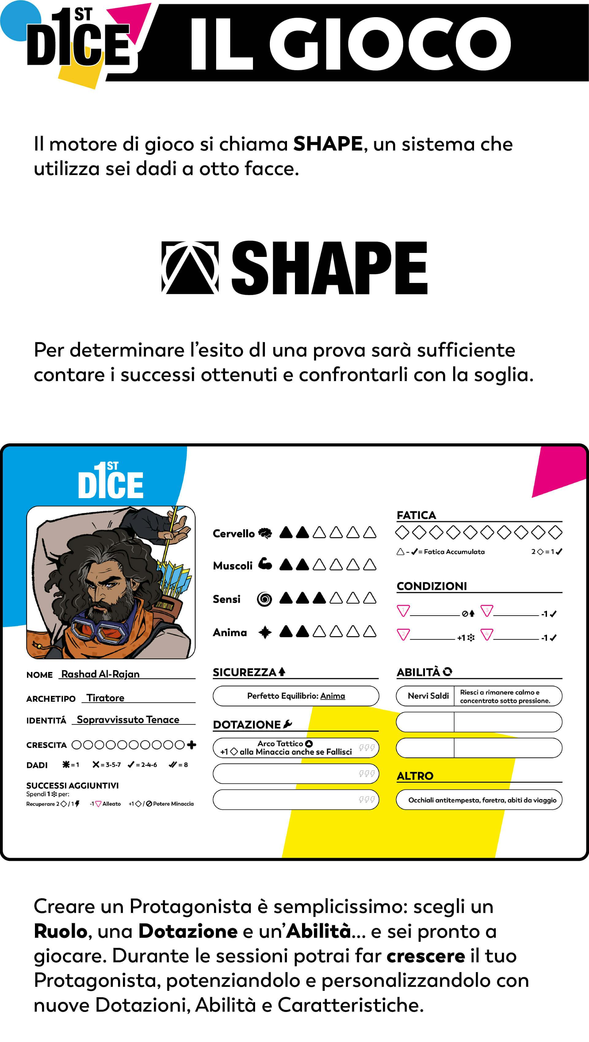 Il motore di gioco si chiama SHAPE, un sistema che utilizza sei dadi a otto facce. Per determinare l’esito dI una prova sarà sufficiente contare i successi ottenuti e confrontarli con la soglia.